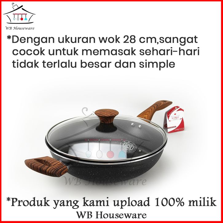 Panci set tutup kaca + sodet Alumunium Anti Lengket Stir Wok 28 Cm Black Marble SUPRA