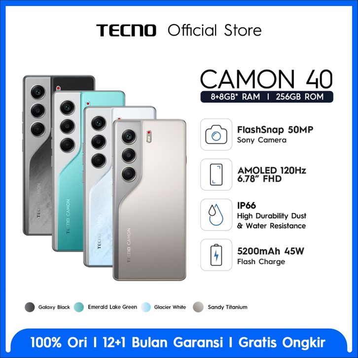 TECNO CAMON 40 8+8GB*256 GB, 50MP Sony + 8MP Ultra Wide Camera, 32MP Front Camera, 120hz AMOLED