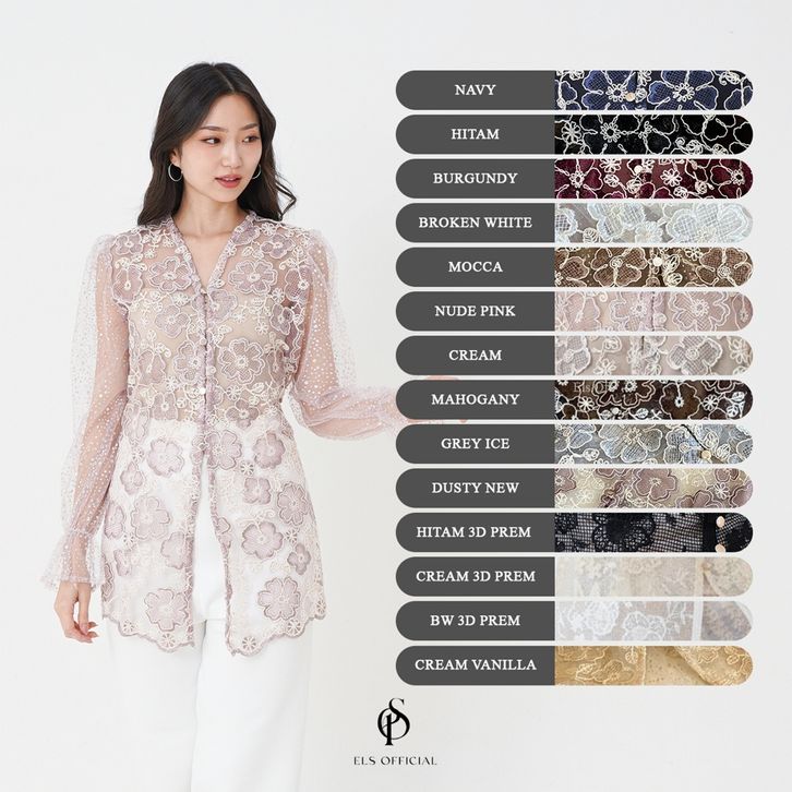 Elzia Navy, Elzia Hitam, Elzia burgundy , Elzia broken white, Elzia mocca , Elzia Nude Pink, Elzia cream , Elzia Mahogany, Elzia Grey Ice, Cream 3D premium , BW 3d premium, Elzia Cream Vanilla