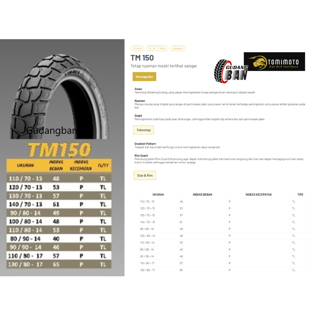 ( TM150 - RING 14 ) TOMIMOTO BAN SEMI TRAIL MATIC DUAL PURPOSE Uk 80 90 100 110 TUBELESS FREE PENTIL