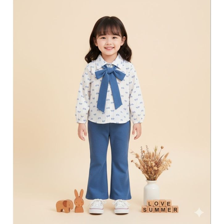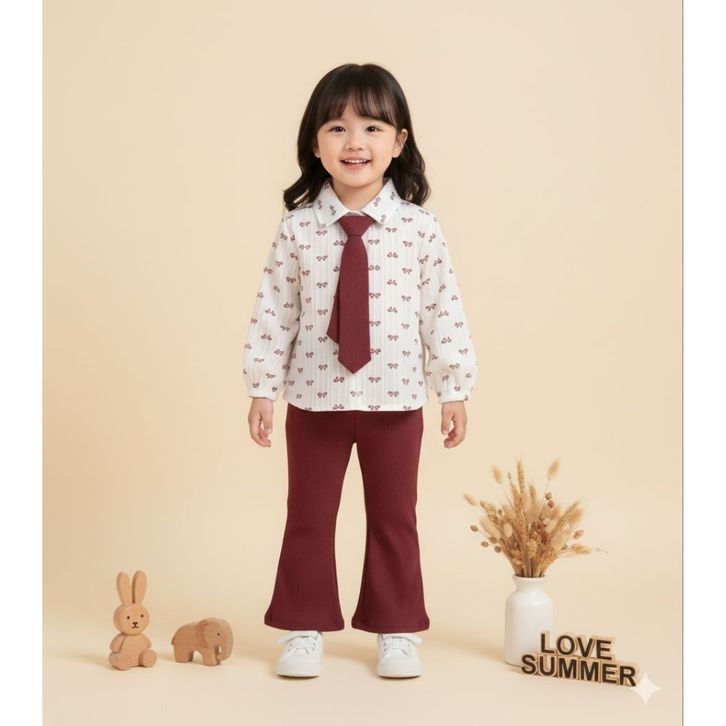 Setelan baju anak perempuan motif pita celana cutbray usia 2-10 tahun