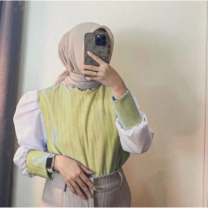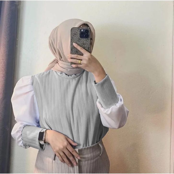 [Mall] Blouse Wanita Beli 1 Gratis 1 Terbaru Korea Jumbo Import Knit Puff Mix Satin Lengan Balon Puffy Top Style Kekinia