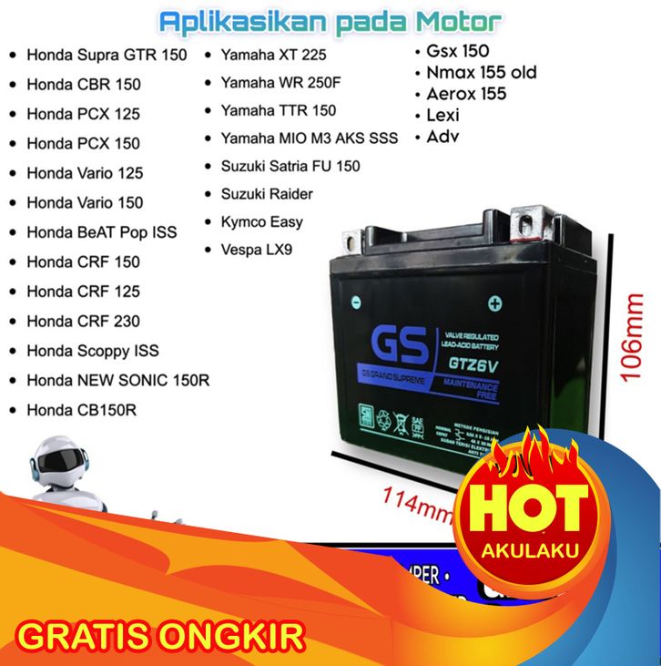 ORIGINAL- AKI MOTOR SATRIA FU 150 , VARIO 125/150, SONIC. NMAX GTZ6V 12V 6AH