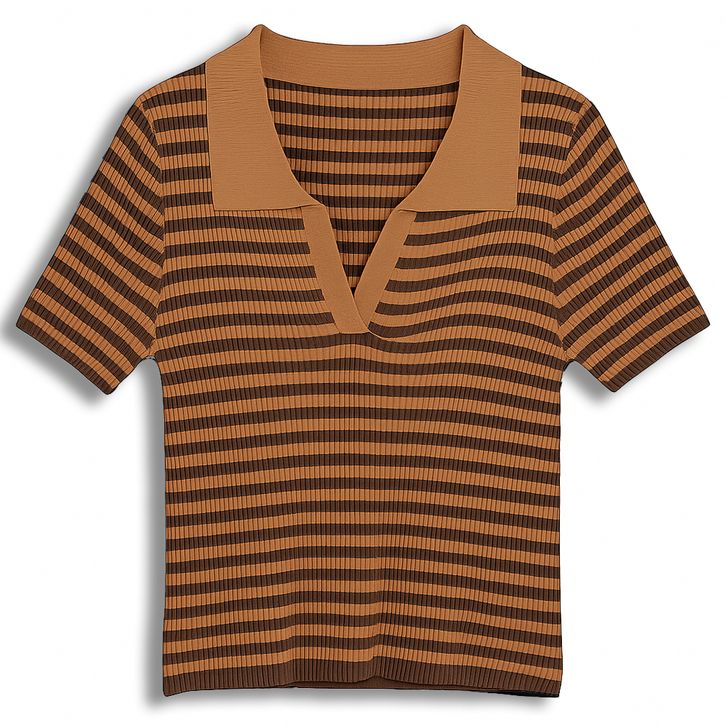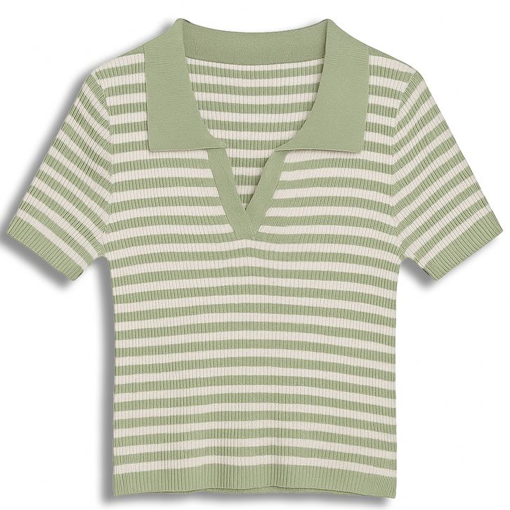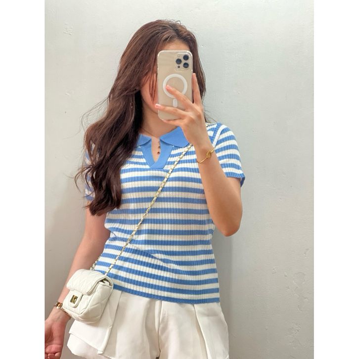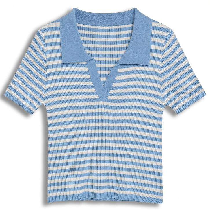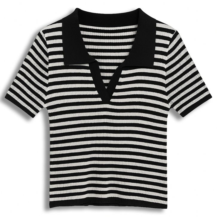 Atasan Rajut Wanita Stripe Hitam Putih Kerah Polo Lengan Pendek Knit Top Korean Style Slim Fit