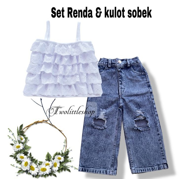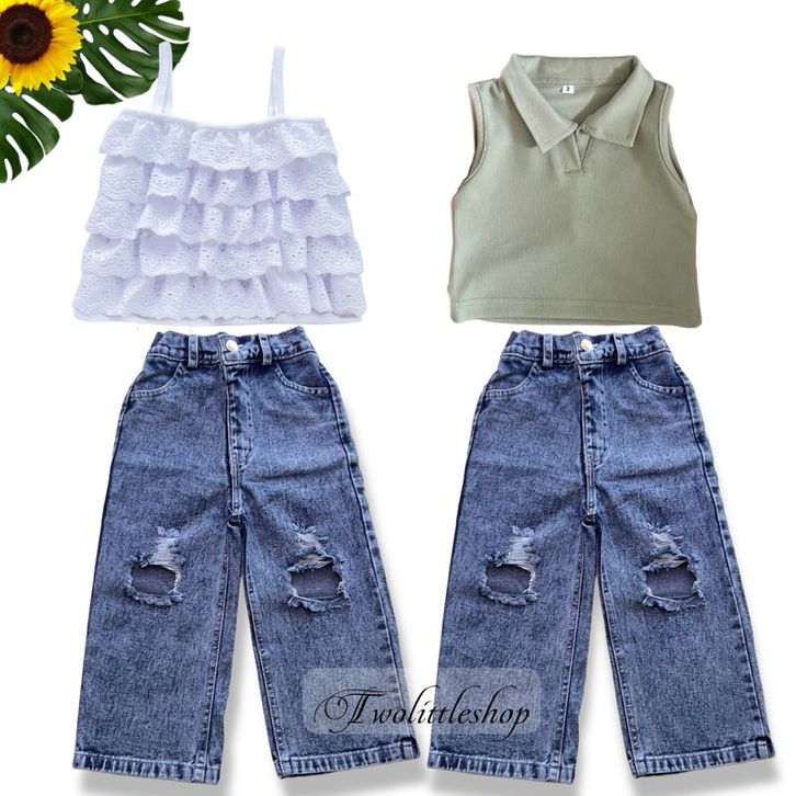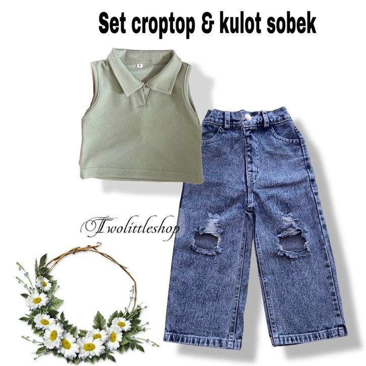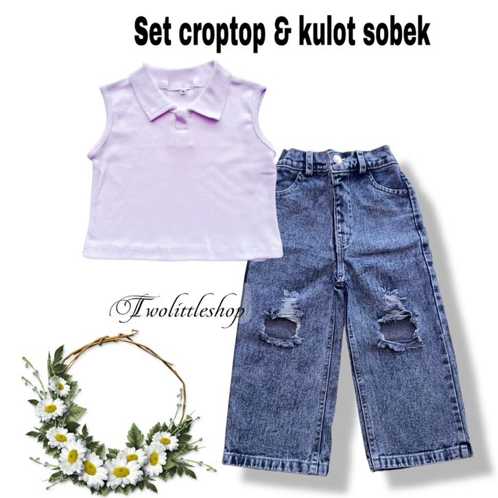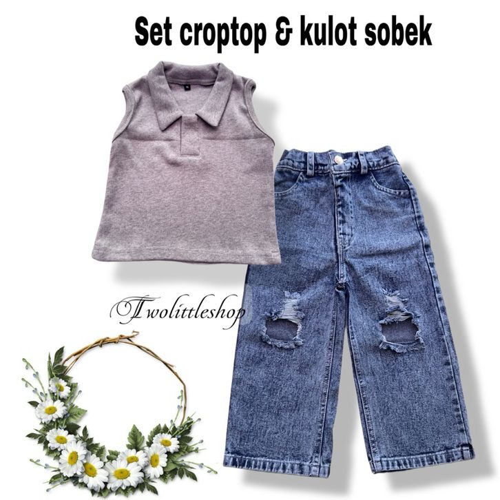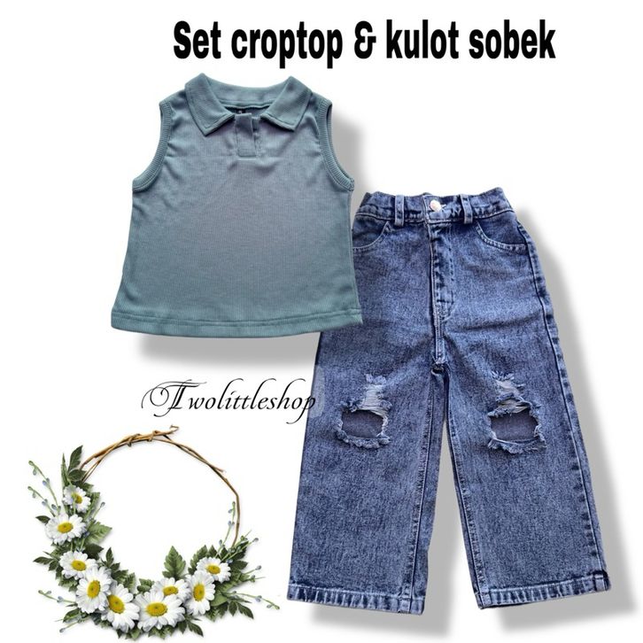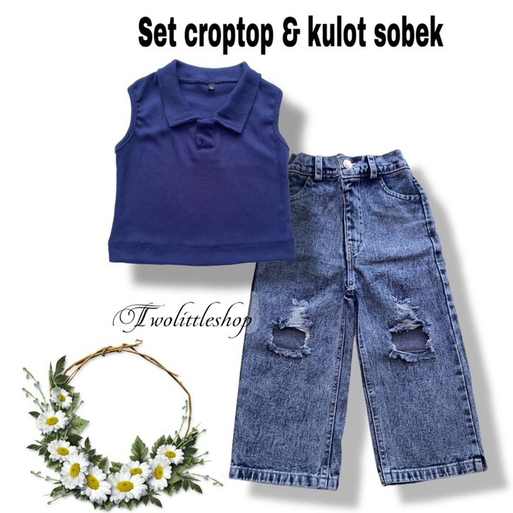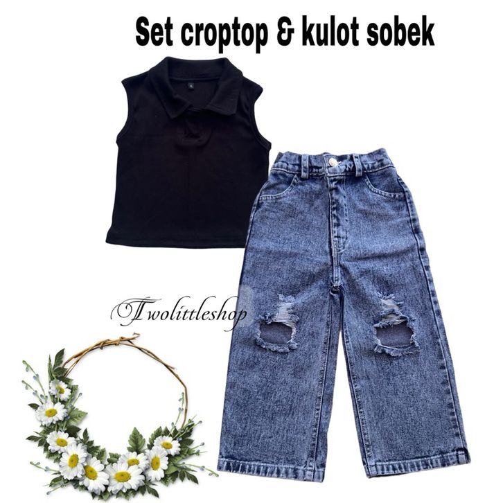[Star] Setelan Anak Perempuan Usia 1-8Th Model Crop Top Kerah Lengan Singlet Celana Kulot Sobek Terbaru Import