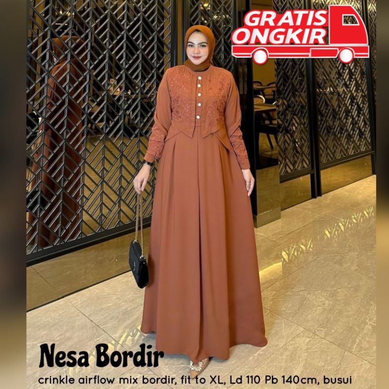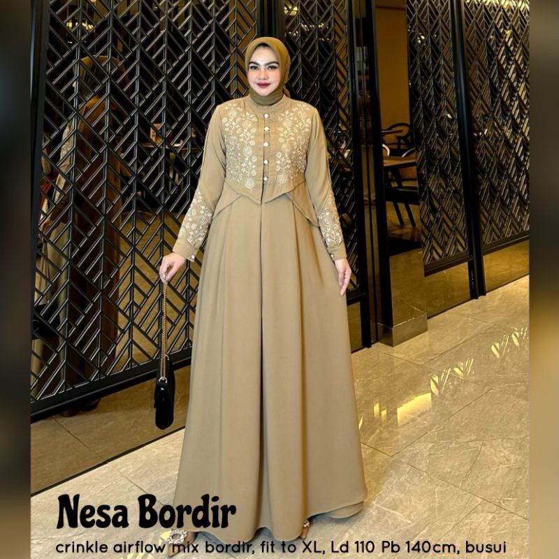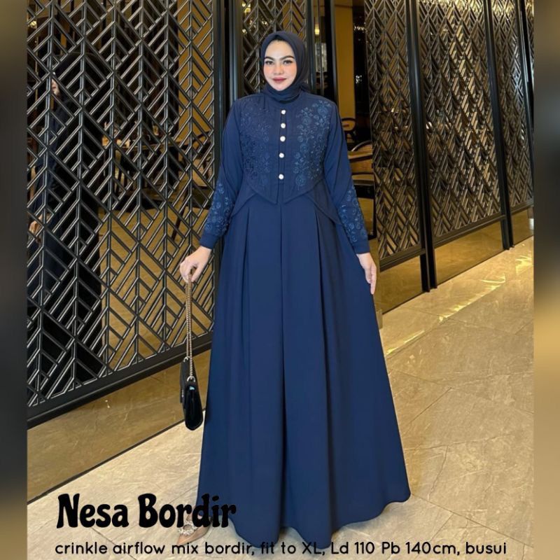 Nesa Dress Bordir Gamis Muslim Wanita Matt Cringkle Airflow All Size Fit To XXL Besar OOTD Kondangan l Lebaran Premium
