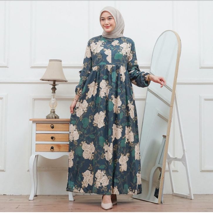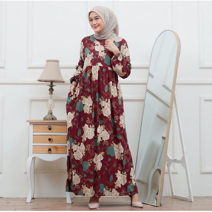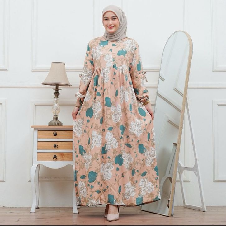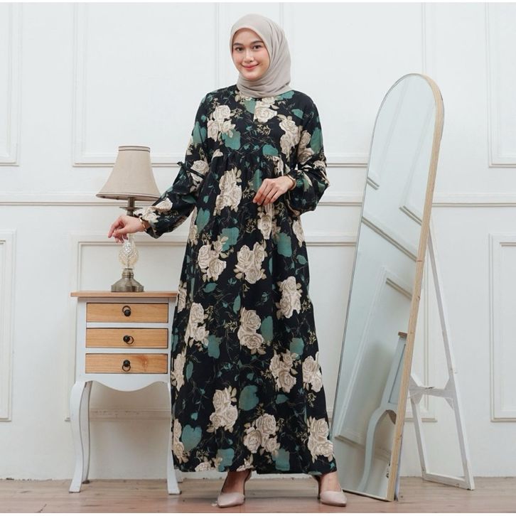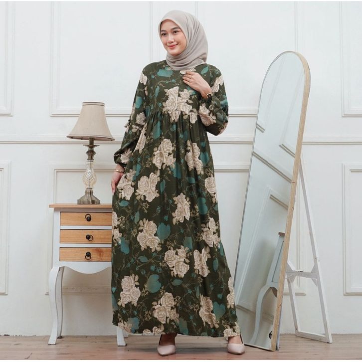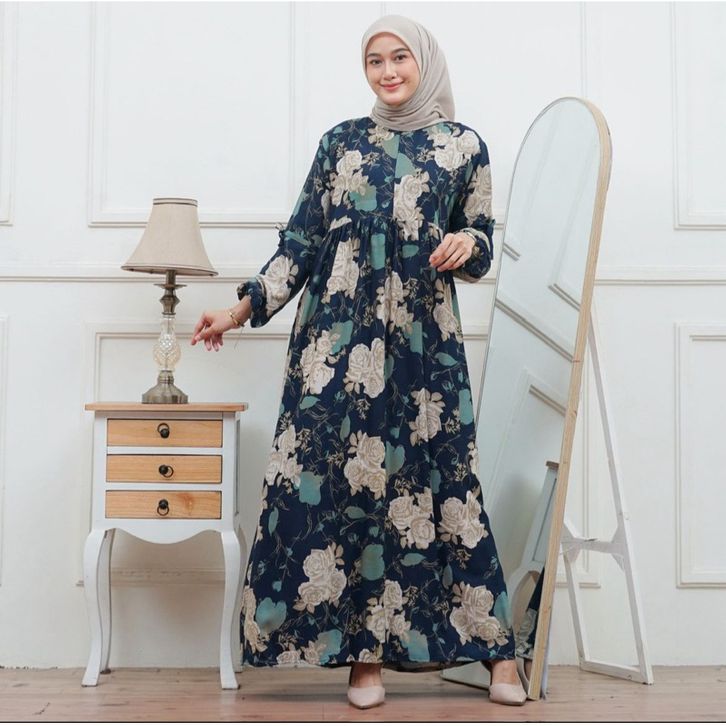 Gamis Rayon Motif Busui Lengan Tali Pita Kerah Sanghai dan Resleting Depan dress muslim gamis wanita terbaru 2025 2026
