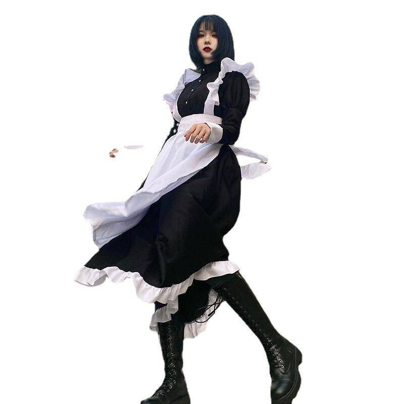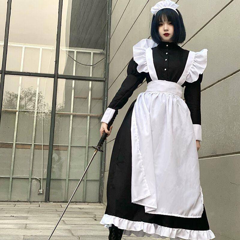 PRIA WANITA MEMAKAI COSPLAY LUCU JEPANG LOLITA ANIME PEMBANTU LOLI HITAM PANJANG GAUN KOSTUM MAID COSTUME SUIT N1