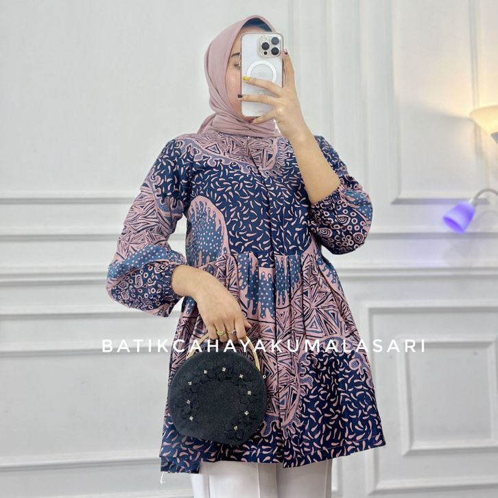 Baju Batik Cewek Modern Batik Wanita Terbaru Atasan Blouse Batik Lengan Panjang Motif Medina Biru Katun Prima Premium
