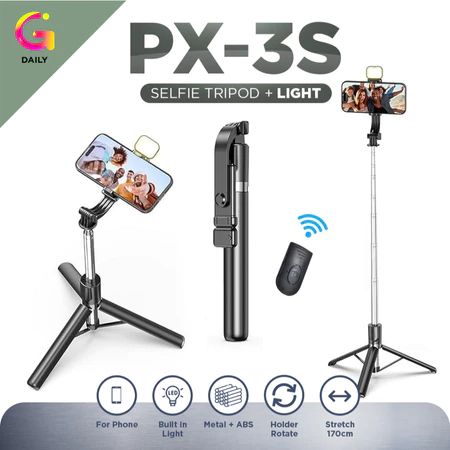 Tripod Px-3s Tinggi 170cm Wireless R1l Selfie Stick Hp Lengkap Dengan Remot Bluetooth Dan Lampu Led