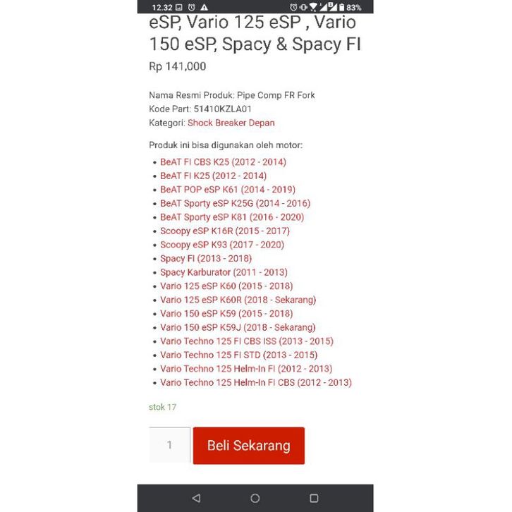 FREE ONGKIR Paket As shock Sok Depan Honda Beat Fi Pop Scoopy Spacy F1 Vario 110 125 150 New Esp KZL