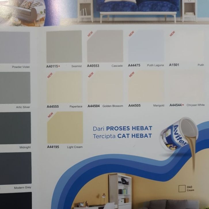 680 SAFARI , 650 SWEET PINK, 720 CANDY PINK, 735 BRIGHT RED , 725 CHERY PINK , 745 FIESTA, 731 SUNSHINE , 750 SUNNY YELLOW, 755 GOLDEN YELLOW , 770 EMERALD, 740 LEMON YELLOW , 831 LIGHT CREAM, 620 APPLE GREEN , 771 KIWI GOLD, 896 METRO WHITE , 600 BLUE HARMONY, 660 LILAC FROST , SW SUPER WHITE , 671 MIDNIGHT, 670 ARTIC SILVER , SB SUPER BLACK, 651 CARNATION PINK , AT-1 BARLEY WHITE, 816 ILLUSION , 040 CREAM , 812 FLAMINGO, 522 APRICOT , 630 TANGERINE , AT-4 ROSE WHITE, 892 MAGNOLIA , AT-05 LILY WHITE, N14 002 CLEAR LAKE , PS-8 SMILEY, 752 CHAMPAGNE , 050 SOFT YELLOW, 751 LEMON BURST , 760 FRESH MINT , 615 SUNSET, 775 TROPICAL , 1759T (HIJAU SAGE), 1766P YOUNG SHEPHERD , 260 GREEN BAY, 622 FRESH GREEN , 818 FRENCH MINT, 602 SKYWAY , PS-7 ECSTATIC , 621 COOL LIME, 776 TELUR ASIN , 601 BLUE ROMANCE, 1758D TORRENTS , 712 TELUR BEBEK, 711 AQUA MARINE , 661 ROYAL PURPLE, 1755T SKYLARK , 893 POWDER VIOLET, 842 MINT WHITE , 093 ASH GREY , 246 PEARL WHITE, 1762P YOUNG FONDS , 675 MODERN GREY, 700 AZURE BLUE , A40115 SEAMIST, A40553 CASCADE , A44475 PUTIH LAGUNA, A1501 PUTIH , A44544 CHRYSAN WHITE, A44505 MARIGOLD , A44504 GOLDEN BLOSSO, A44555 PAPERLACE , A44195 LIGHT CREAM, G22-006 Prickly Cact , 765 SUN FLOWER, N32-004 SANDY BEACH , N12 003 BAMBOO HOUSE, N2 006 COFFEE BREAK , G26 002 CAPELLA GARD, V16 001 VIOLET DISTR , P20 005 HERBAL REMED, B22 001 TOMORROW NIG , 1765D GREEN HILLS, N23 003 TITANIUM GRE , N22 001 LINEN SHEETS, N7 001 DOVETAIL WHIT , N9 002 INNER BEAUTY, N15 001 HEAVENS GATE , R 1279P SWEET MARION, N6 004 CLOSE TO HOME , N6 006 OLD FRIENDS, V19-001 BLACK PEARL , B18 006 OCEAN WONDER, N8 001 BEIGE HARMONY , N12 004 QUIET VILLAG, N14 006 ALL NIGHT LO , N6 005 PERSONAL SPAC, P3 002 LAVENDER OIL , N7 004 ACOUSTIC SOUL, OW 1011P SOFT TISSUE , B10 001 FALLING SNOW, BGG 1596A HIGH TREK , N5 001 WHITE AS SNOW, B10 001 FALLING SNOW