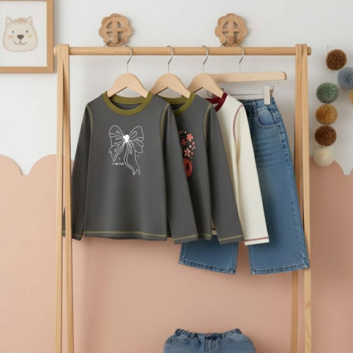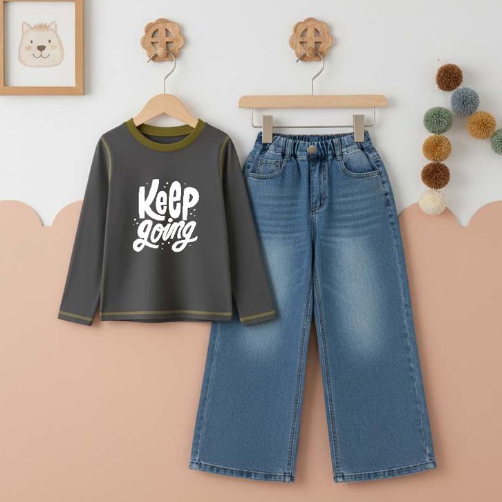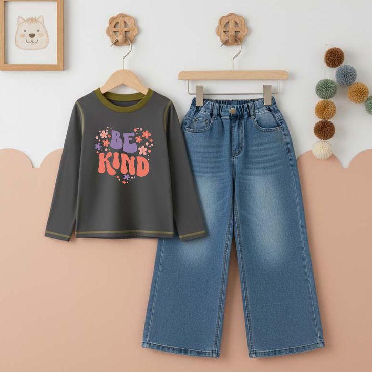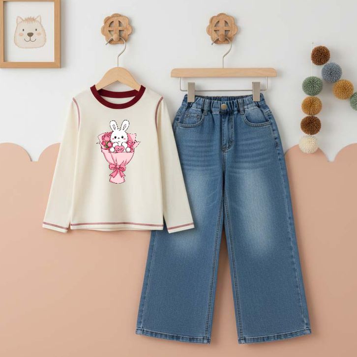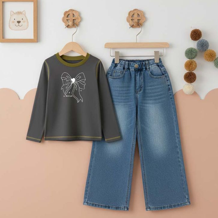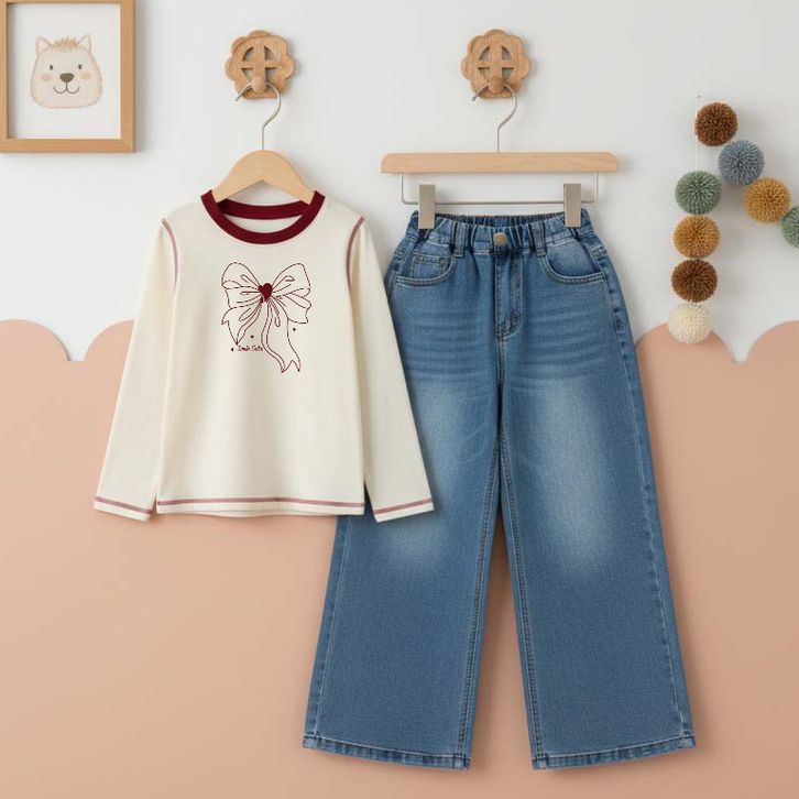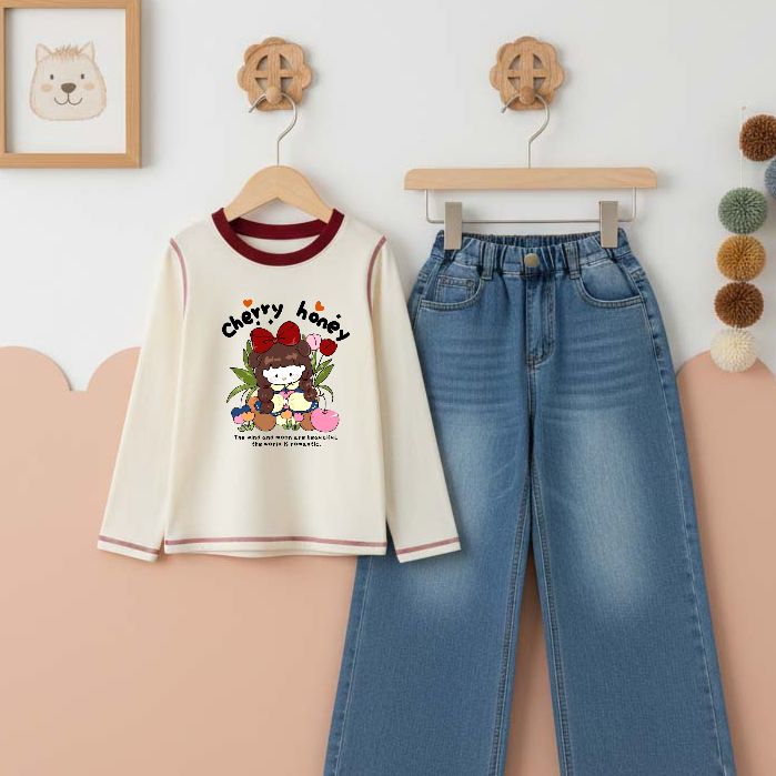 Setelan Anak Perempuan Usia 3 4 5 6 7 8 9 10 11 12 Tahun Kaos Lengan Panjang Katun dan Celana Panjang Kulot Denim Jeans