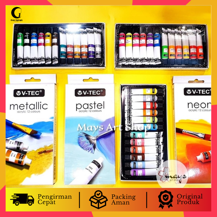 SET CAT AKRILIK ISI 12PCS WARNA PASTEL DAN WARNA NEON V-TEC ISI 12 WARNA X 6 ML - ACRYLIC PAINT LUKIS