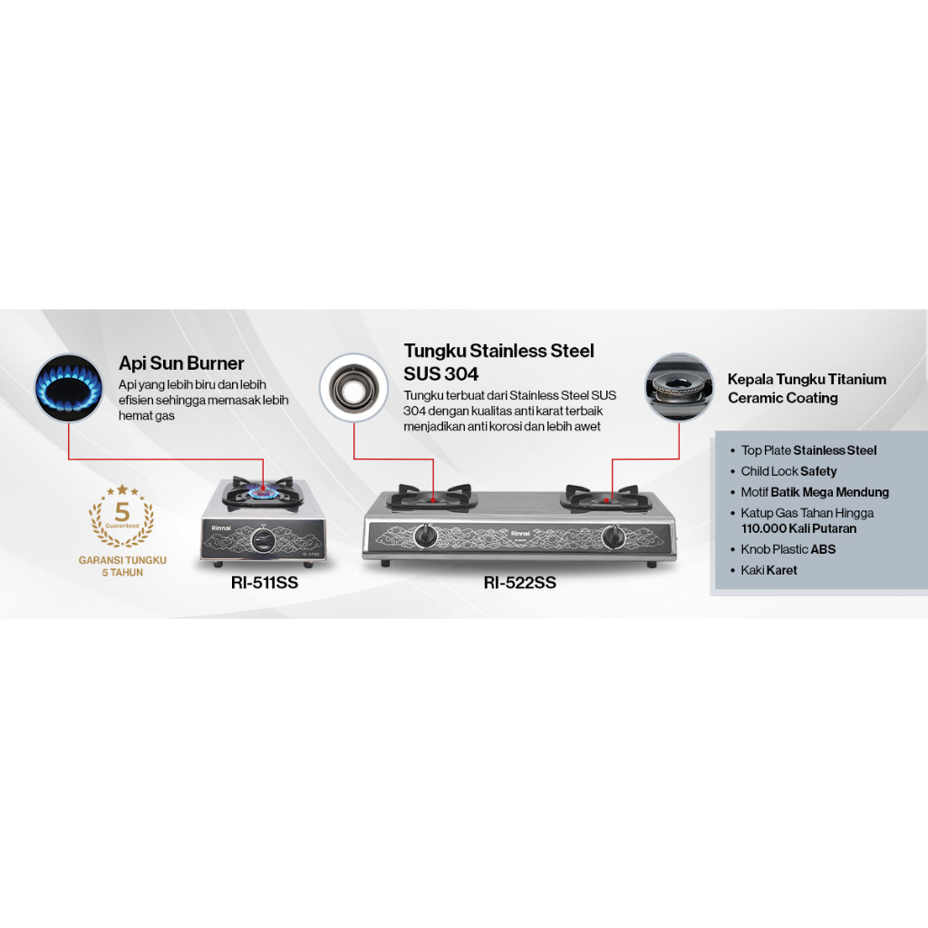 Rinnai RI 511SS Kompor 1 Tungku Body Stainless Steel Tahan Karat