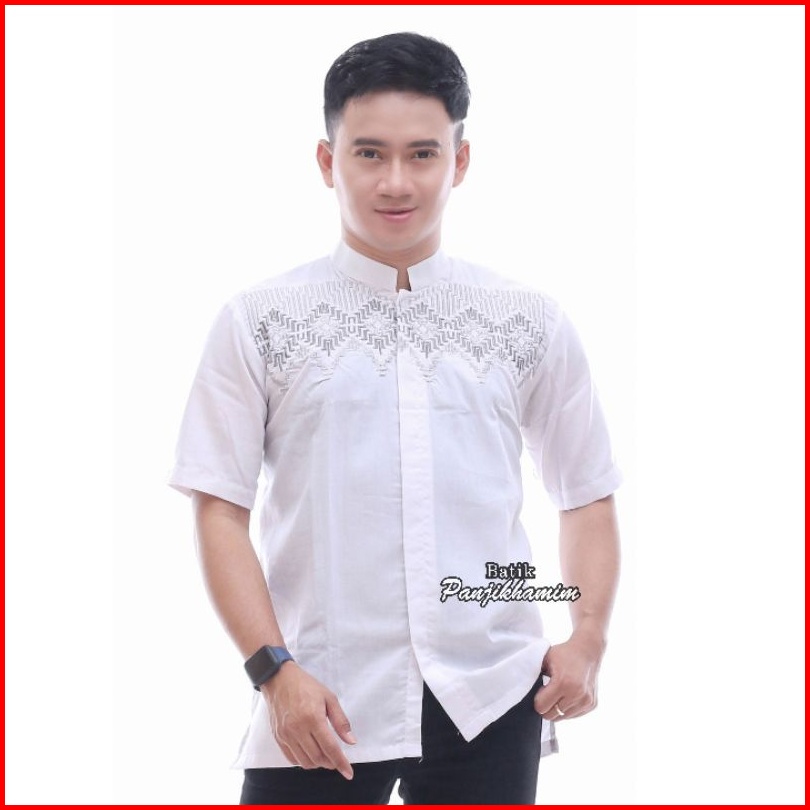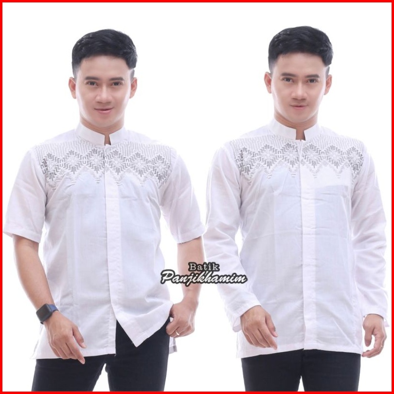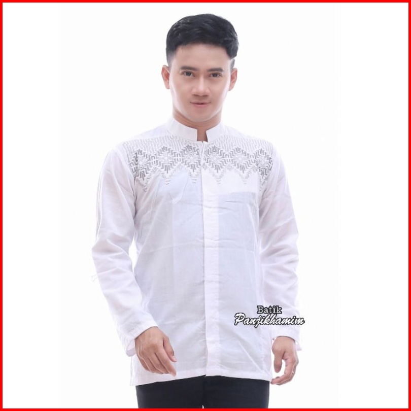 Baju Koko Bordir Putih Lengan Panjang Kemeja Busana Muslim Pria Bahan Katun Saku Samping Batik Panjikhamim