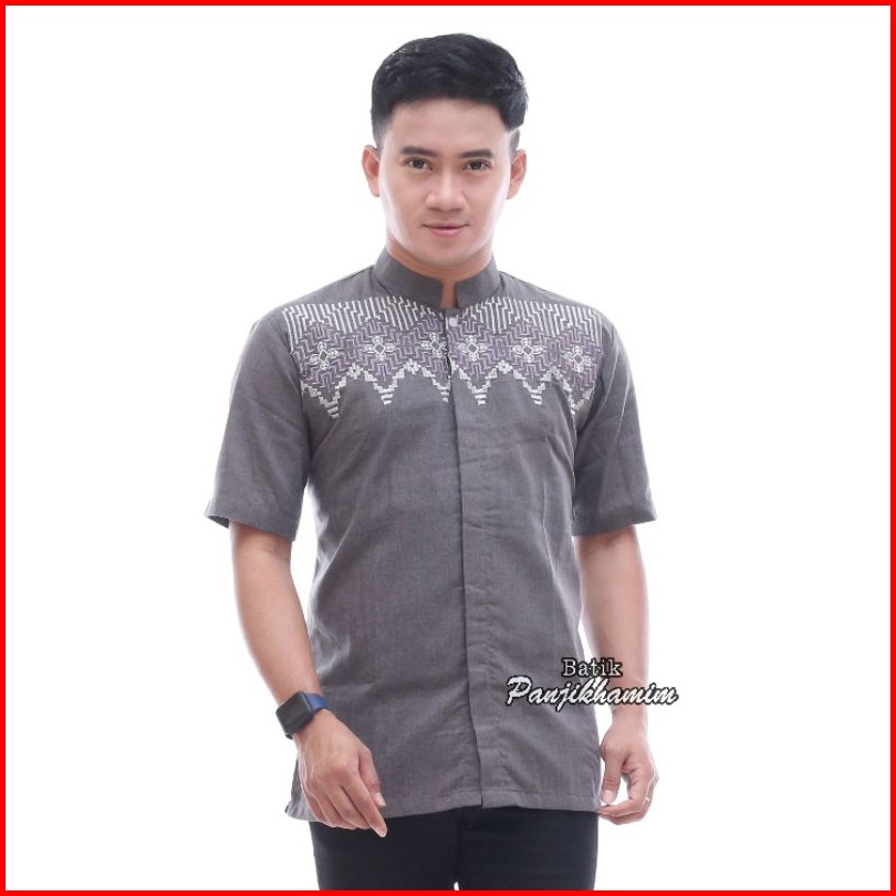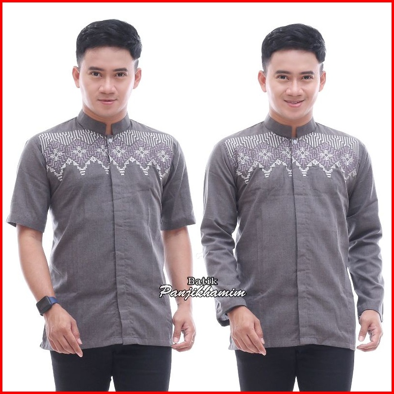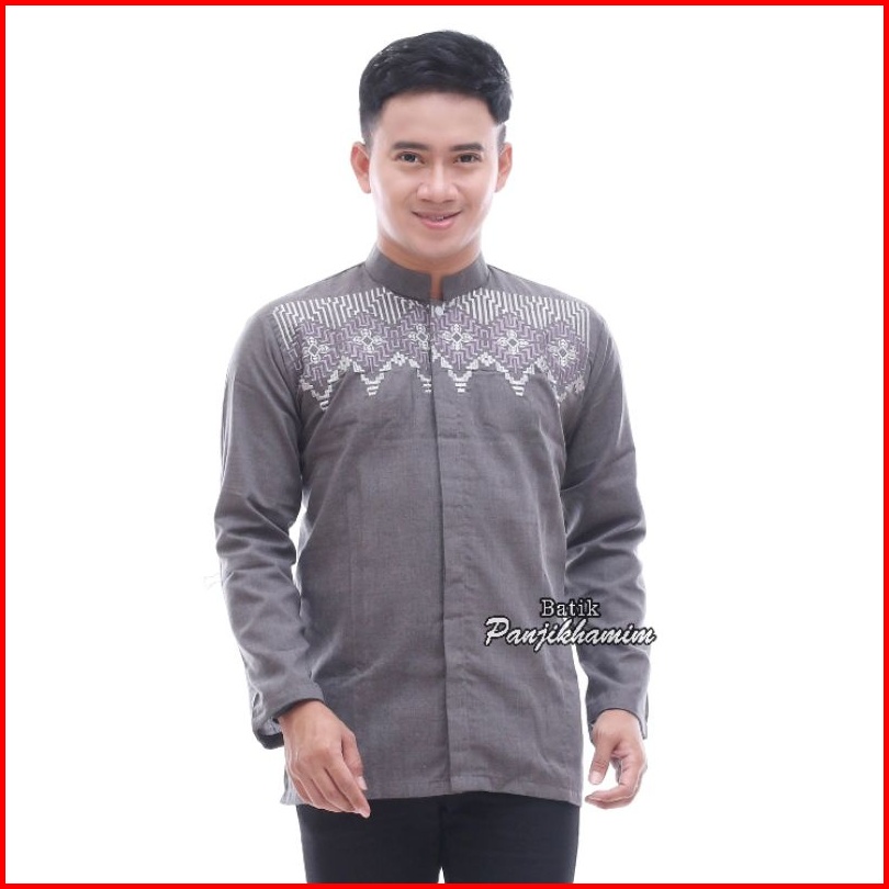 Baju Koko Bordir Lengan Panjang Abu-abu Kemeja Busana Muslim Pria Bahan Katun Saku Samping Batik Panjikhamim