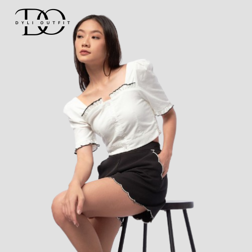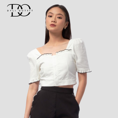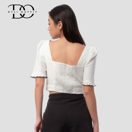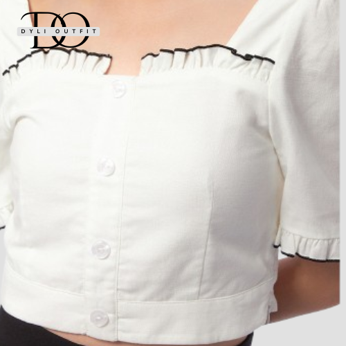 Atasan Wanita Lengan Pendek COLORBOX Ruffle Trim Crop Top Off White FY12