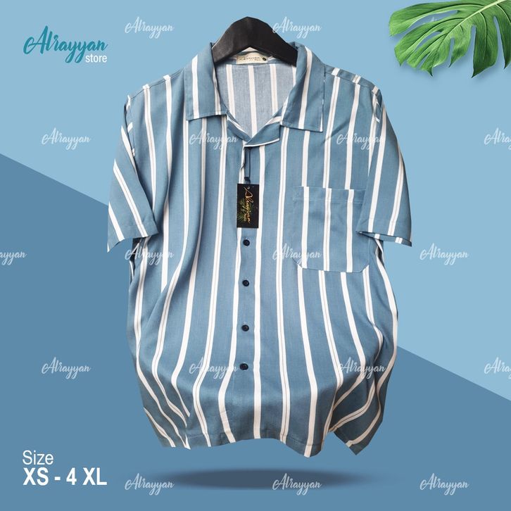 BAJU PANTAI OVERSIZE SPORHEM HAWAI PANTAI BALI COWOK CEWEK KEMEJA PENDEK MOTIF SALUR BIRU PUTIH