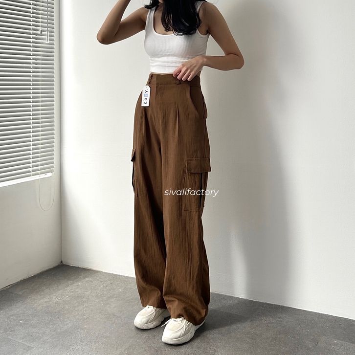 Celana Kargo Kulot Ukuran Petite Linen Crinkle Highwaist Willow Culot Cargo Baggy Culote Pants Celana Panjang Wanita