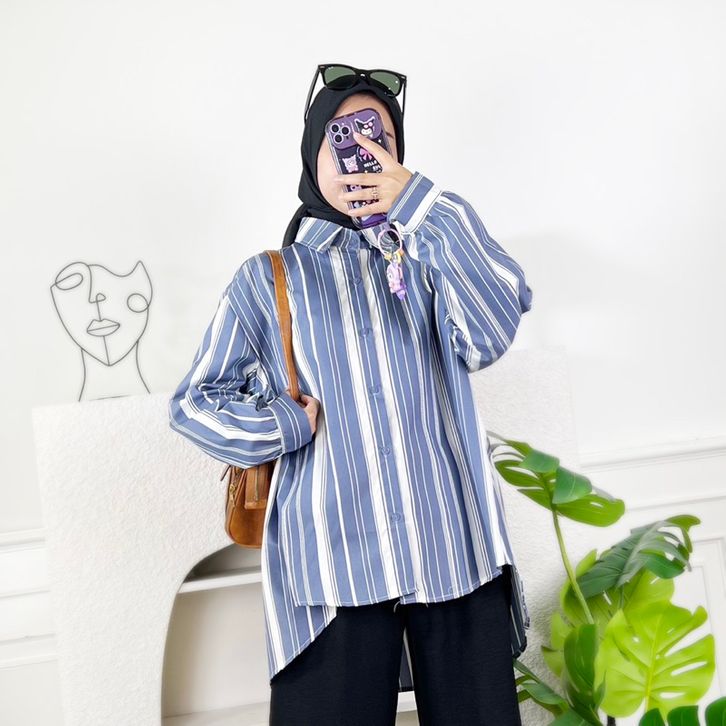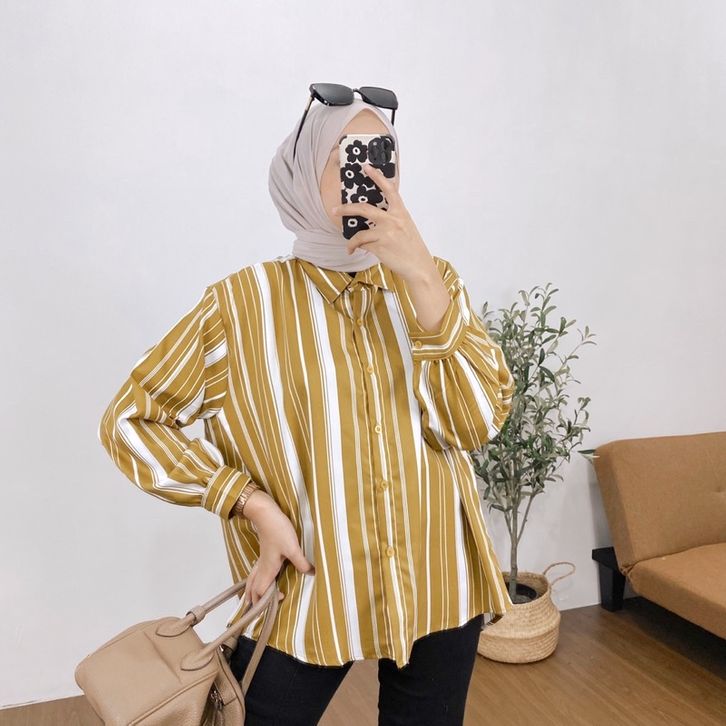 Atasan Kemeja Perempuan Motif Garis Nadine Oversize Baju Lengan Panjang Wanita Kasual Bahan Katun Poly Premium Stylish