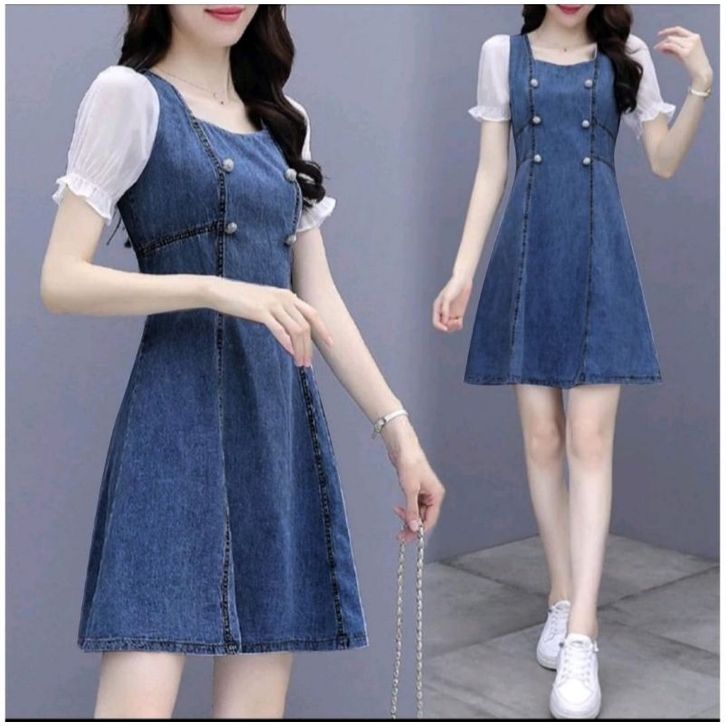 GAUN DRESS JEANS WANITA KOMBINASI SIFON PAKAIAN WANITA FASHION FORMAL CASUAL PAKAIAN DRES PEREMPUAN TERBARU