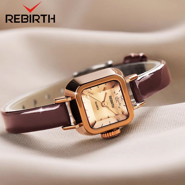 REBIRTH Jam Tangan Wanita Korea Antik Persegi Mini Kuarsa Tali Kulit Jam Tangan Cewek Anti Air RE2047
