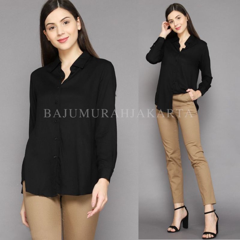 PROMO KEMEJA WANITA KATUN RAYON HITAM LENGAN PANJANG BLOUSE CASUAL POLOS MONALISA KEKINIAN BAJU CEWEK
