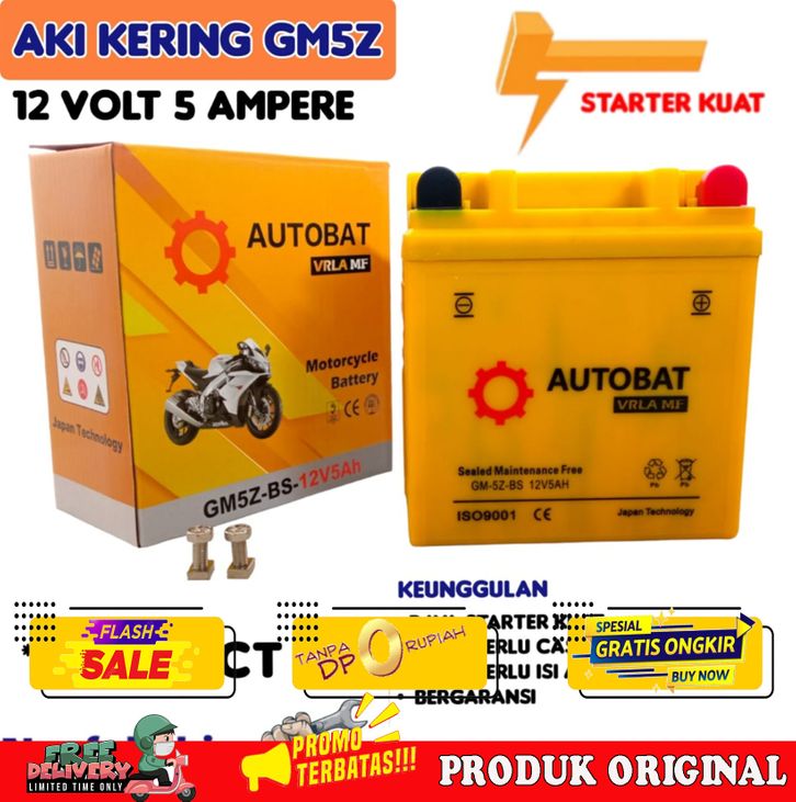 AKI MOTOR MIO SPORTY/SMILE/KARBU JUPITER BURHAN/HONDA GRAND/VEGA ZR/SUPRA FIT AUTOBAT AKI KERING 5 AH