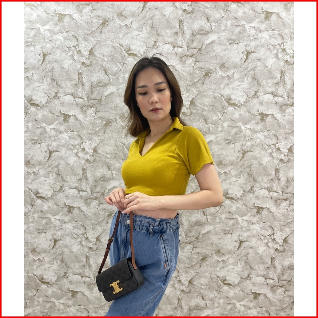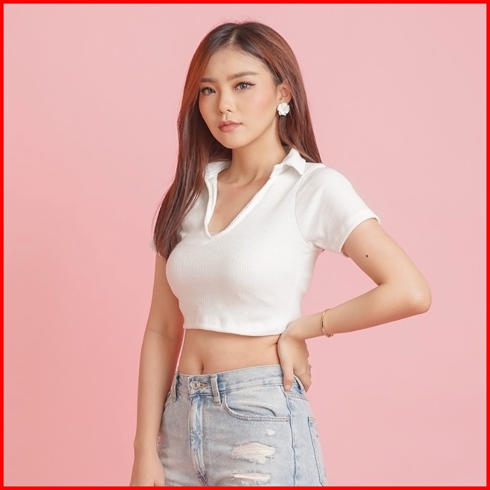 Modavie - Sharlene Crop Top Korea Knit Sexy Korean Style Kaos Kerah Wanita Polo Shirt