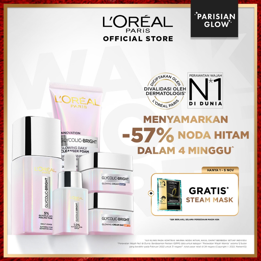 L'OREAL PARIS GLYCOLIC BRIGHT GLOWING SKINCARE SET - FACIAL FOAM 50 ML, TONER 65ML, SERUM 15ML, DAY & NIGHT CREAM 15ML
