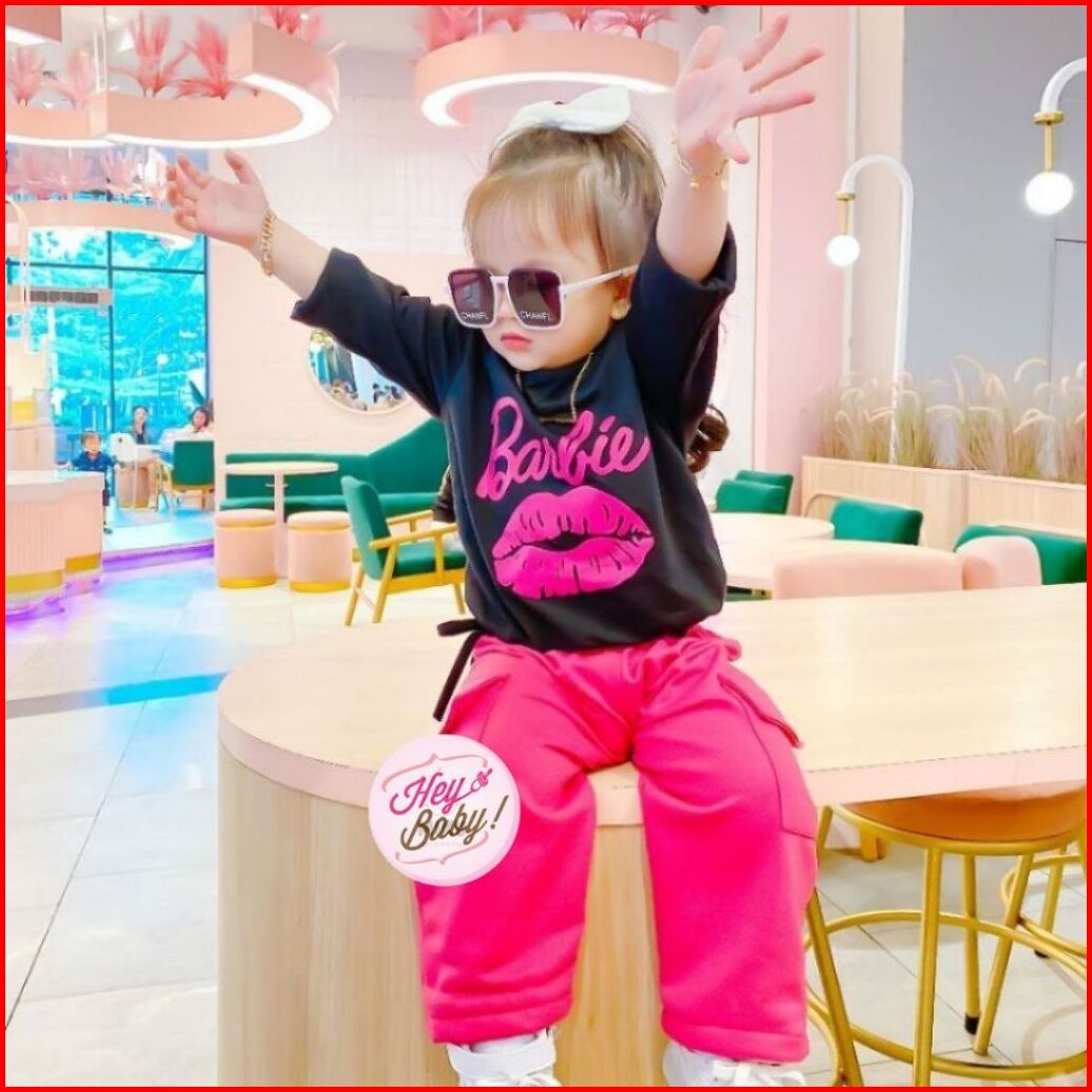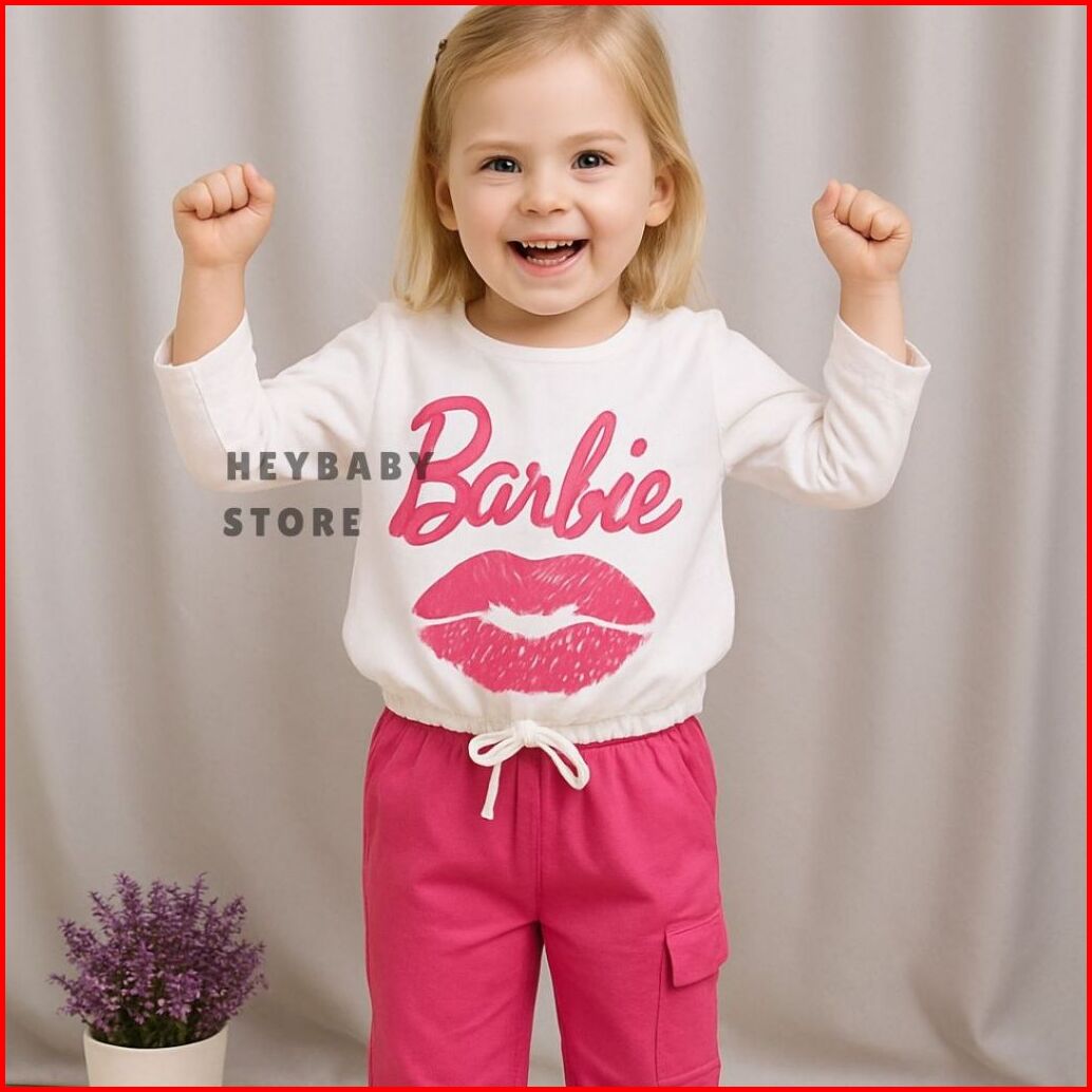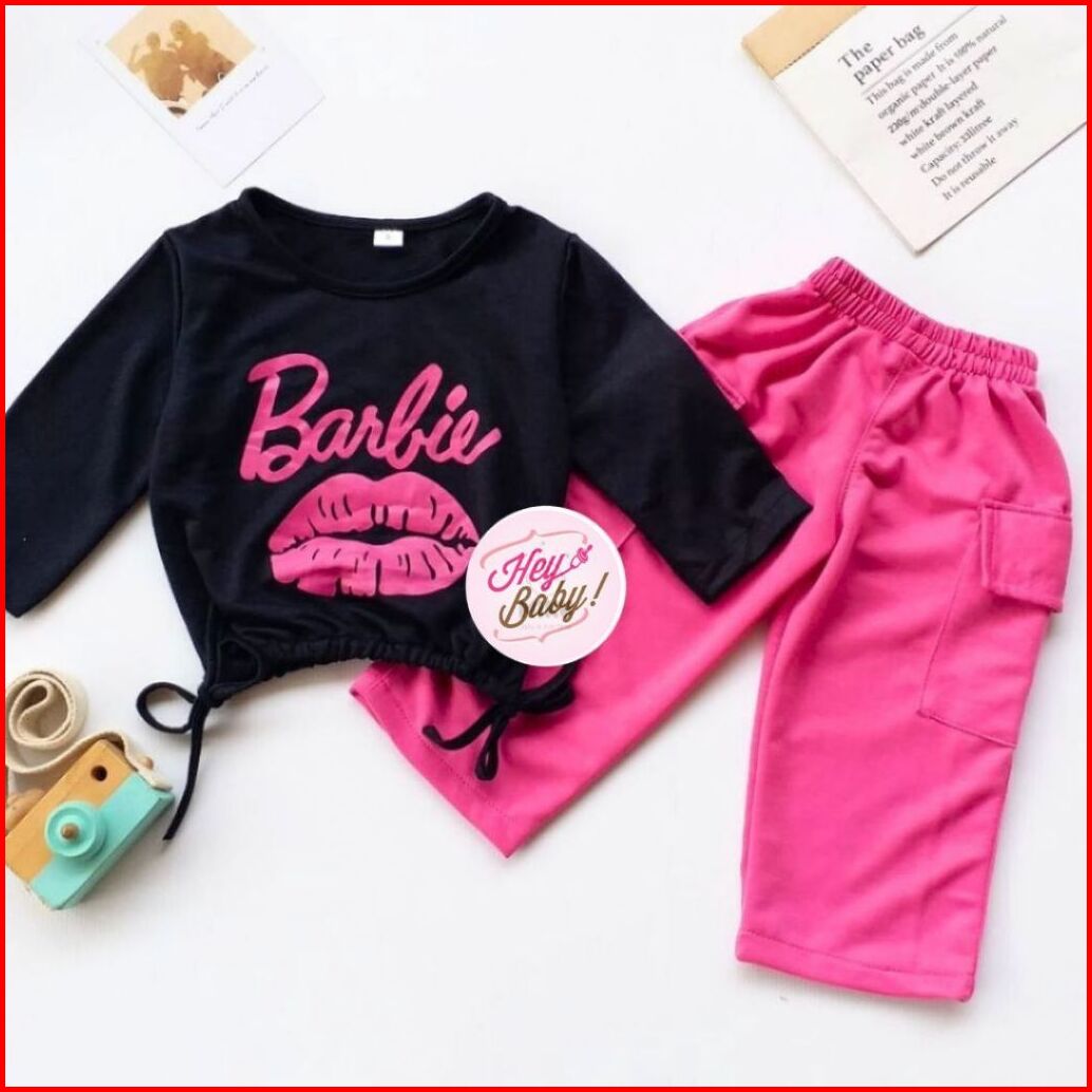 Promo 9.9 Heybaby Set Barbie Lips Setelan Baju Serut Anak Bayi Perempuan Celana Cargo Set Anak Perempuan Atasan Serut