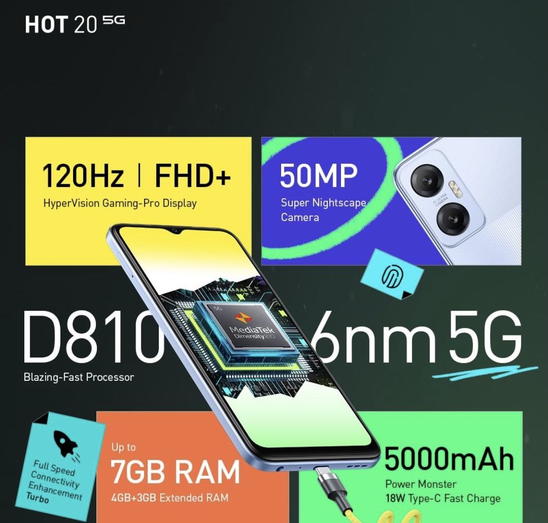 HP INFINIX HOT 20 5G 4GB+128GB | MediaTek Dimensity 810 | 5000mAh | GARANSI 1 TAHUN