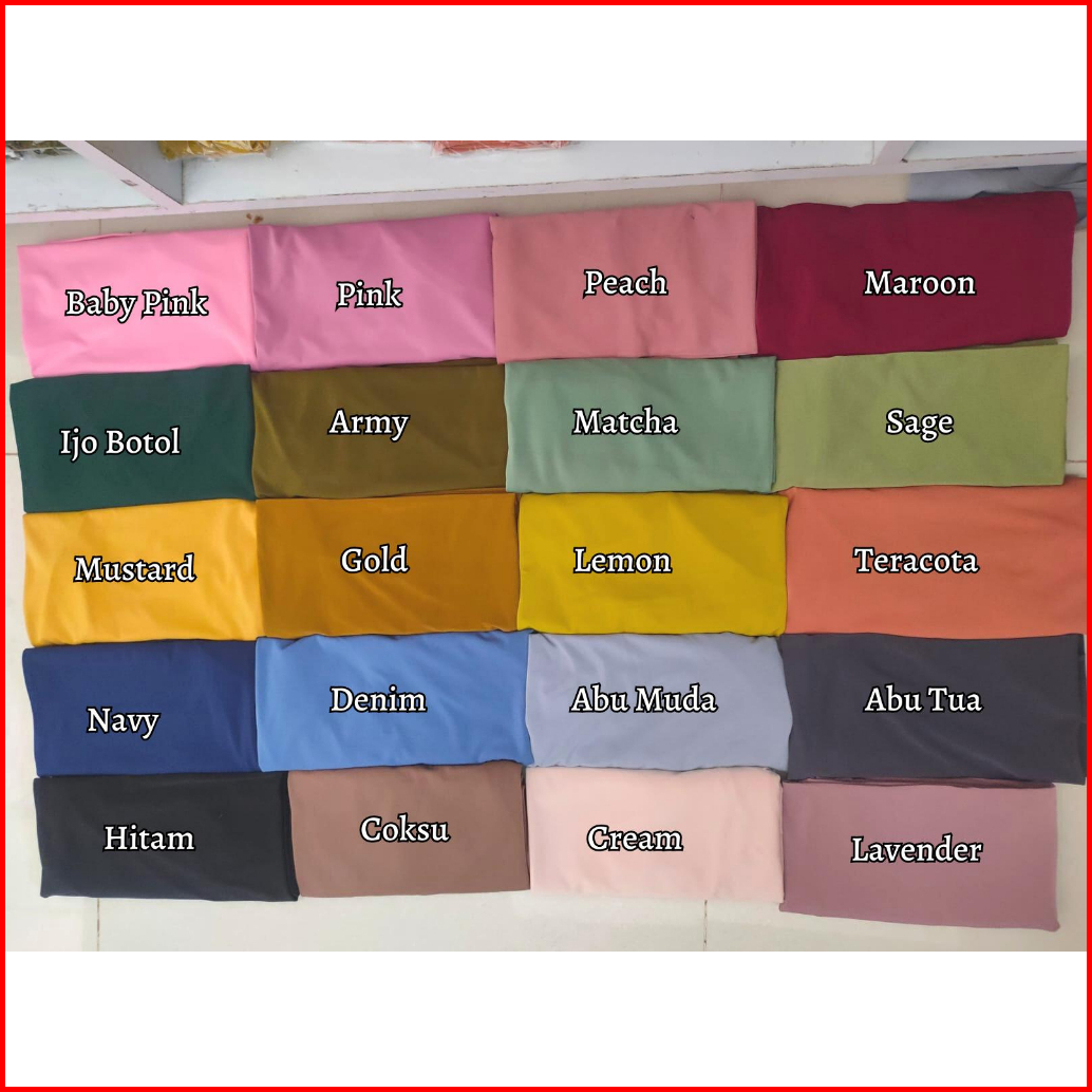 Hitam, Hijau Botol, Maroon, Coksu, Abu Tua, Abu muda, Lavender, Navy, Lemon, Mustard, Peach, Pink, Cream, Army, Baby Pink, Denim, Teracota, Sage, Gold, Matcha, Tosca, Fuschia, Hazel, Taupe, Almond, Pear, Mauve, Uniform, Putih, Caramel, Lilac, Baby Blue, Pink Soft, Tortilla, Seafom, Yellow, Coffe, Gingger, Coklat Muda, Blue Jeans, Latte