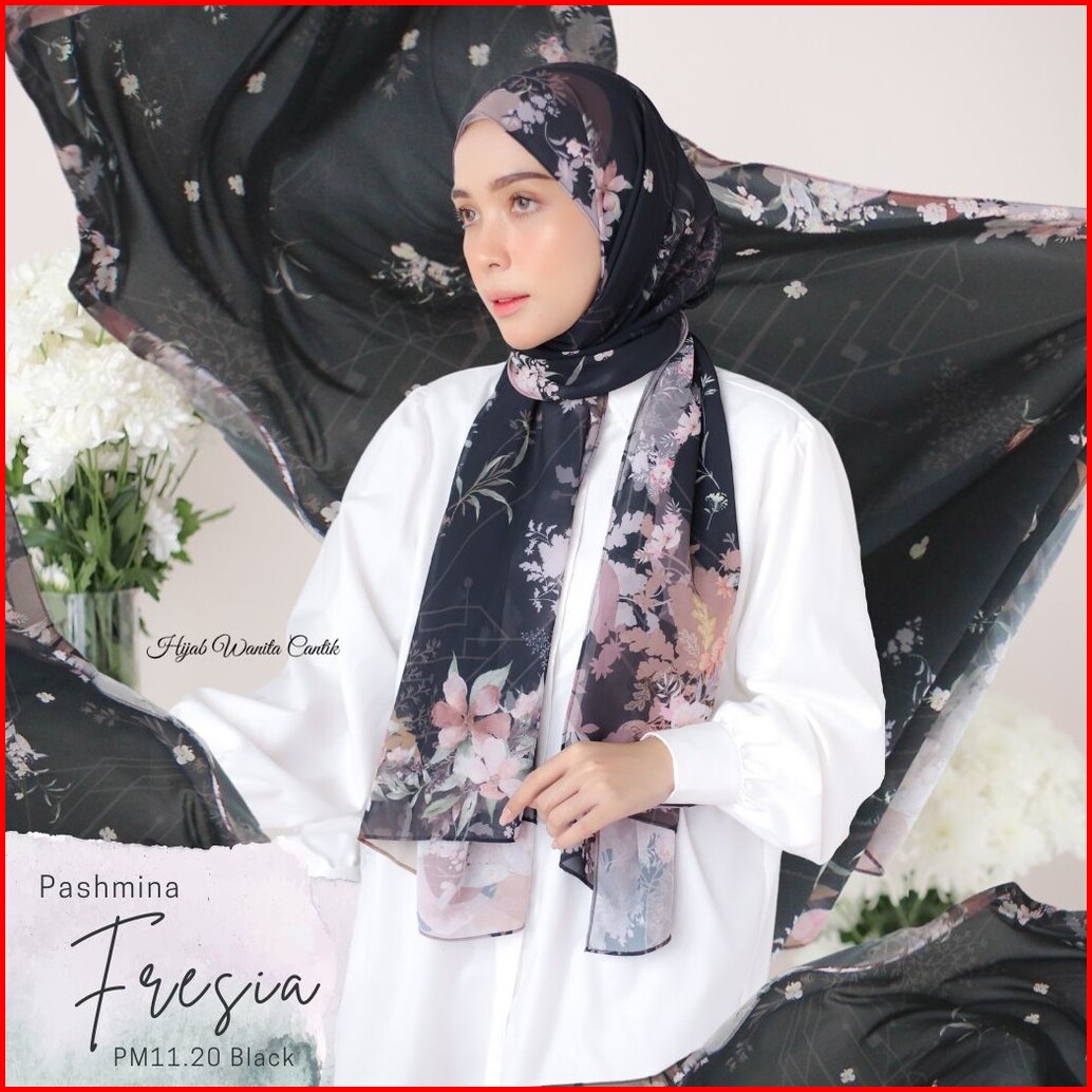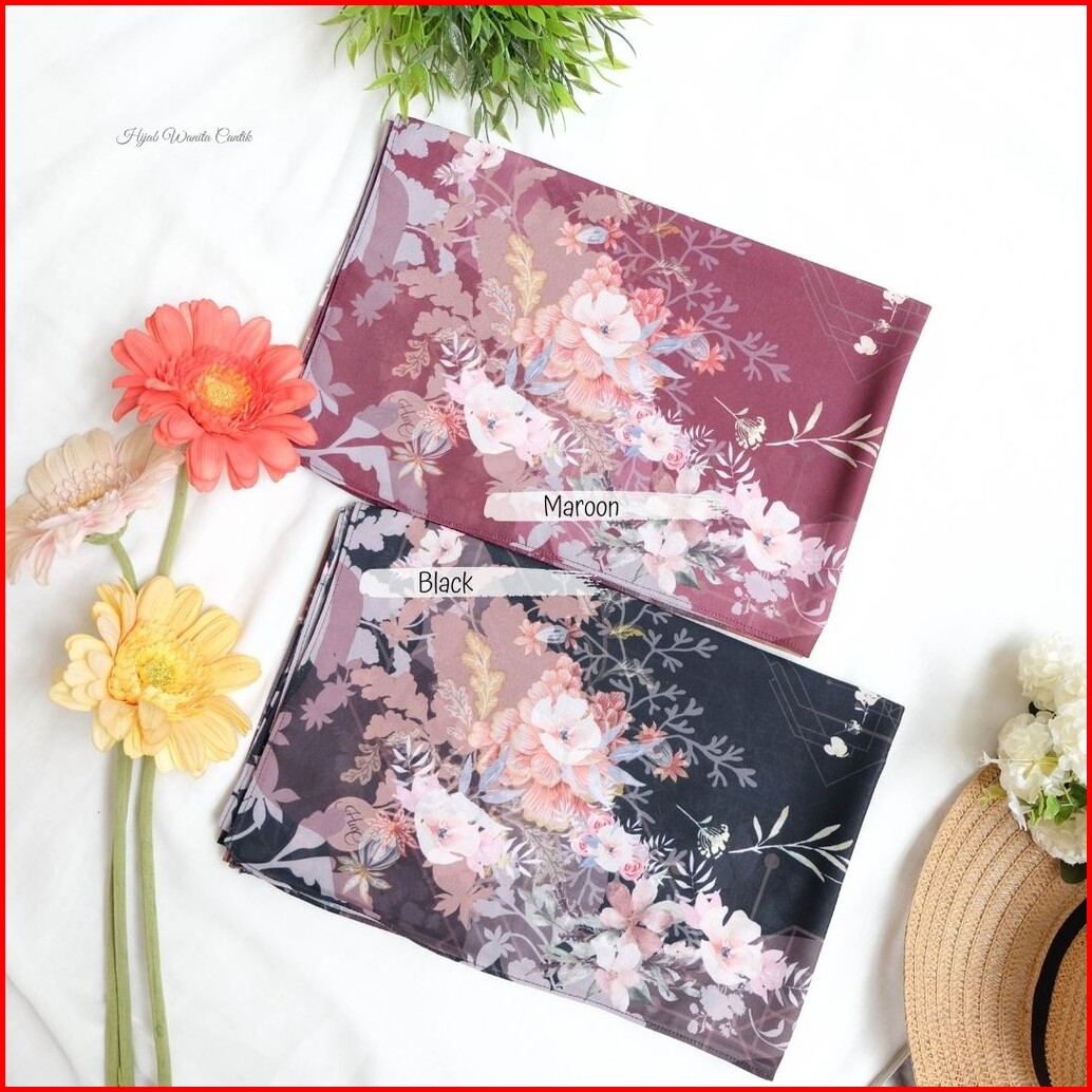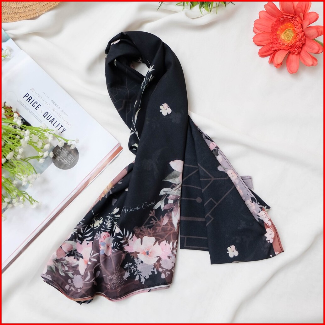 Hira - Hijabwanitacantik - Pashmina Fresia Series Pm11.20 Black Hijab Printing Premium Motif Bunga Jilbab Cerutti Babydo
