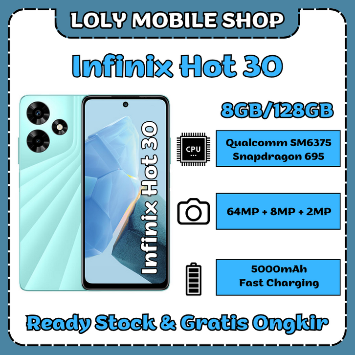 Infinix Hot 30 8GB/128GB | MediaTek Helio G88 | 5000mAh Fast Charging | Kamera Utama 50MP | Garansi 12 Bulan | Original.