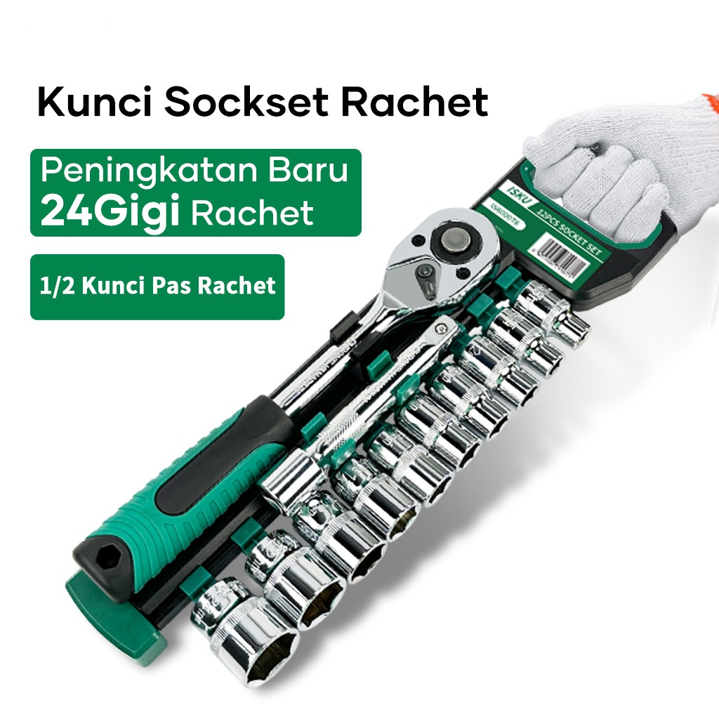 ISKU Kunci Shock 12Pcs Drive Socket 1/2 Inch Socket Wrench Set 8-24mm Dan 10Inch Extension Bar Bahan Chrome Vanadium Kun