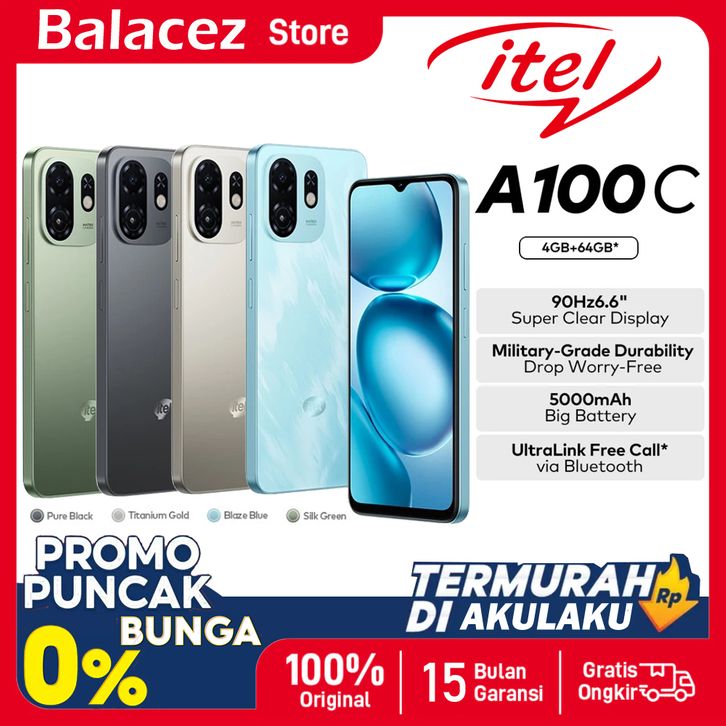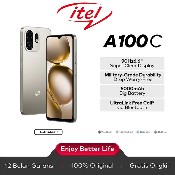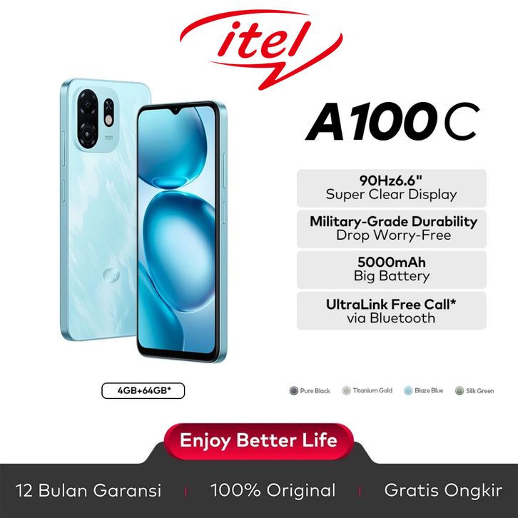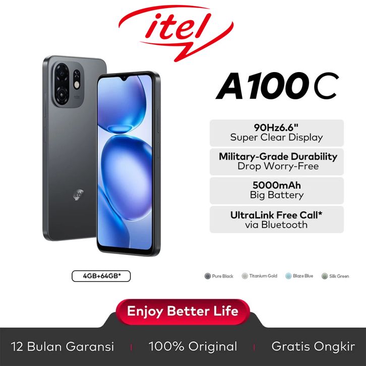 itel A100C 4+64GB Layar 6.6" 90Hz Tahan Banting Military-Grade Big Memory UltraLink Free Call 5000mAh Battery