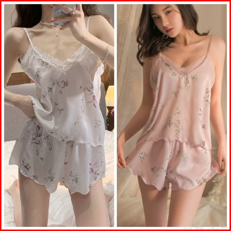 Yesy Fashion Sleapwear Pajamas Baju Tidur Sexy Satin Stelan Bunga Stel