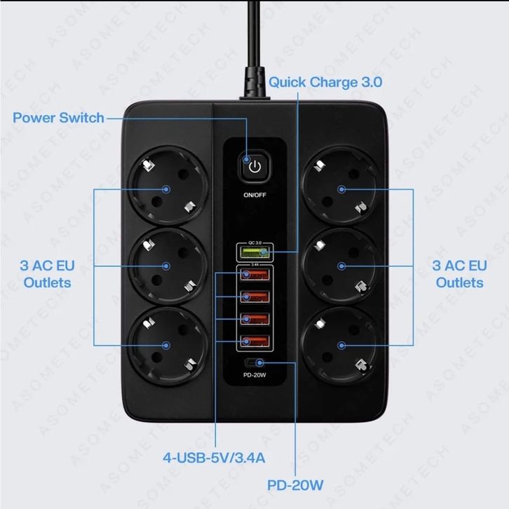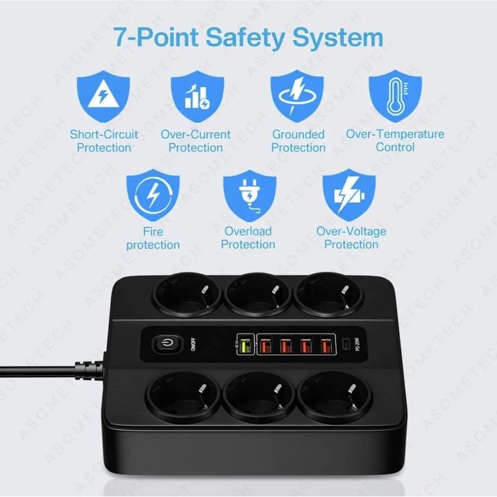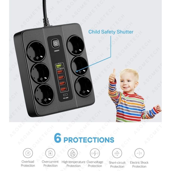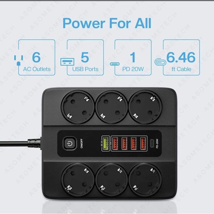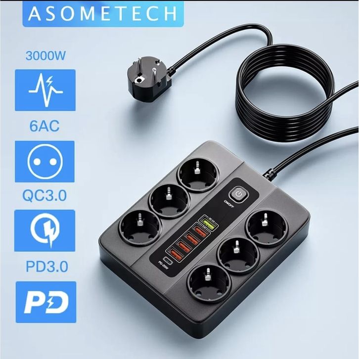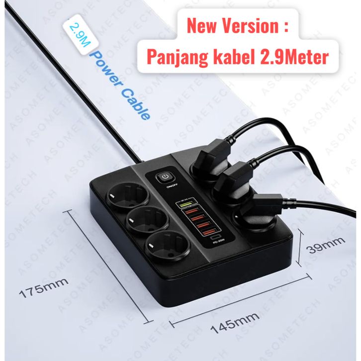 COLOKAN LISTRIK STOP KONTAK MULTIFUNGSI| POWER SOKET 6 COLOKAN STOP KONTAK 5 USB A, 1 USB C 3000WATT BKL 11EU
