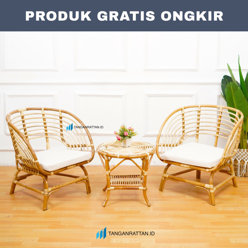 KURSI TERAS BUSKBO DAN MEJA ROTAN + BANTAL / KURSI TAMU SANTAI ROTAN / KURSI ROTAN MINIMALIS FINISHING