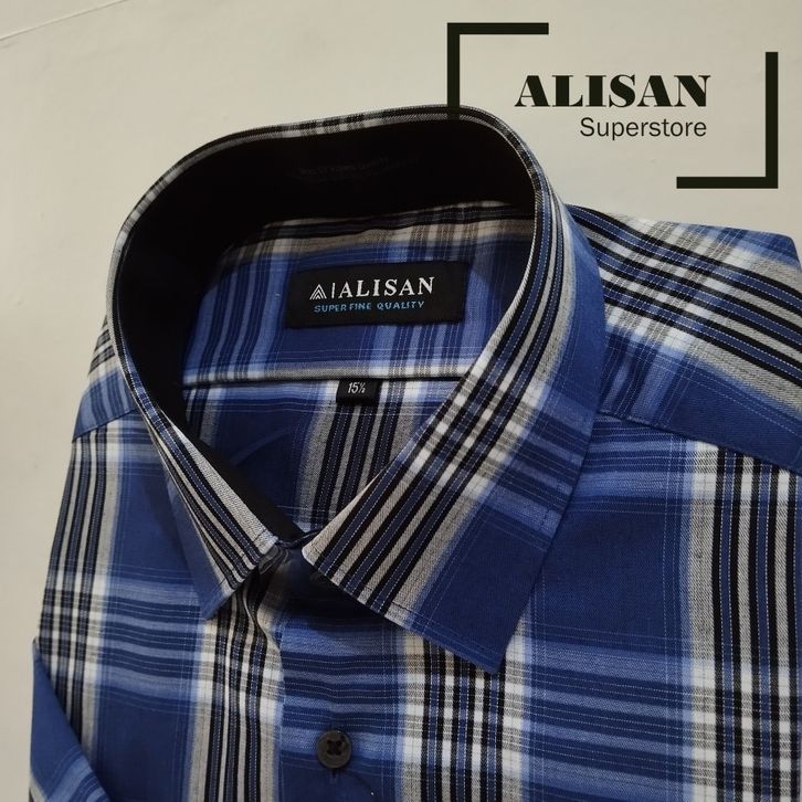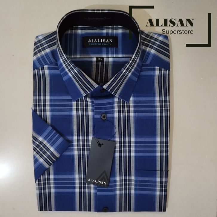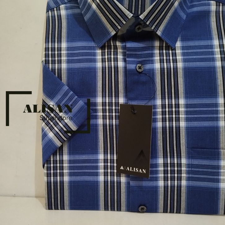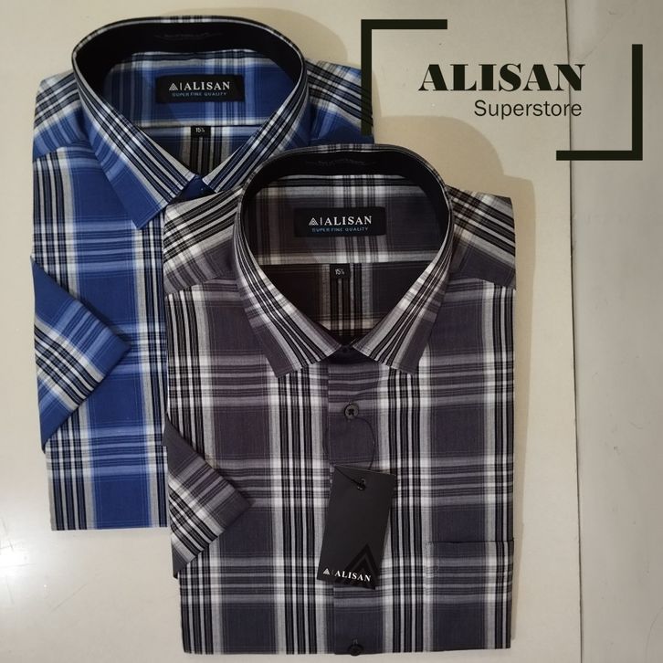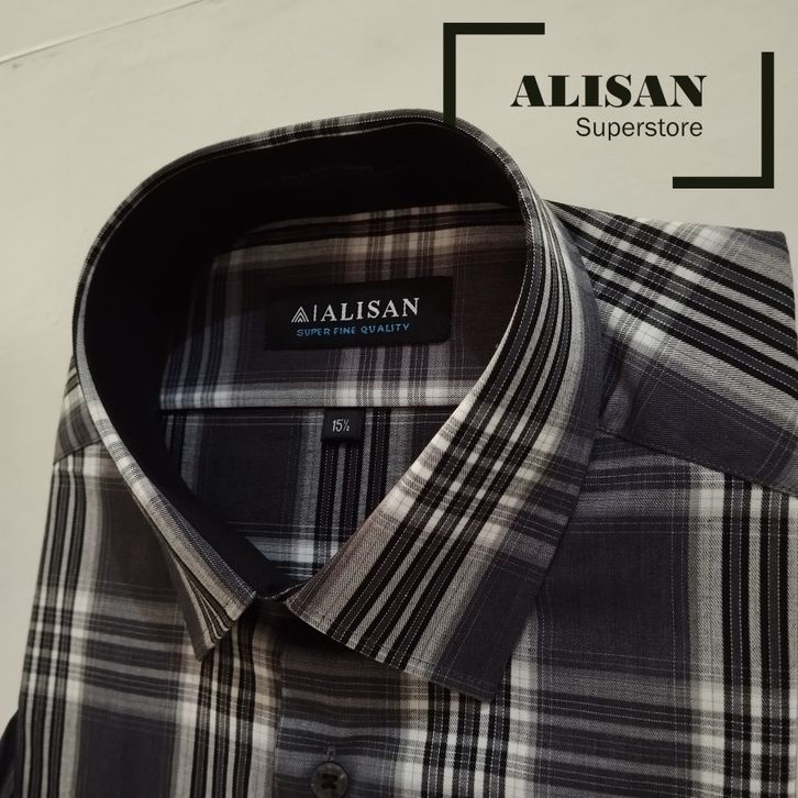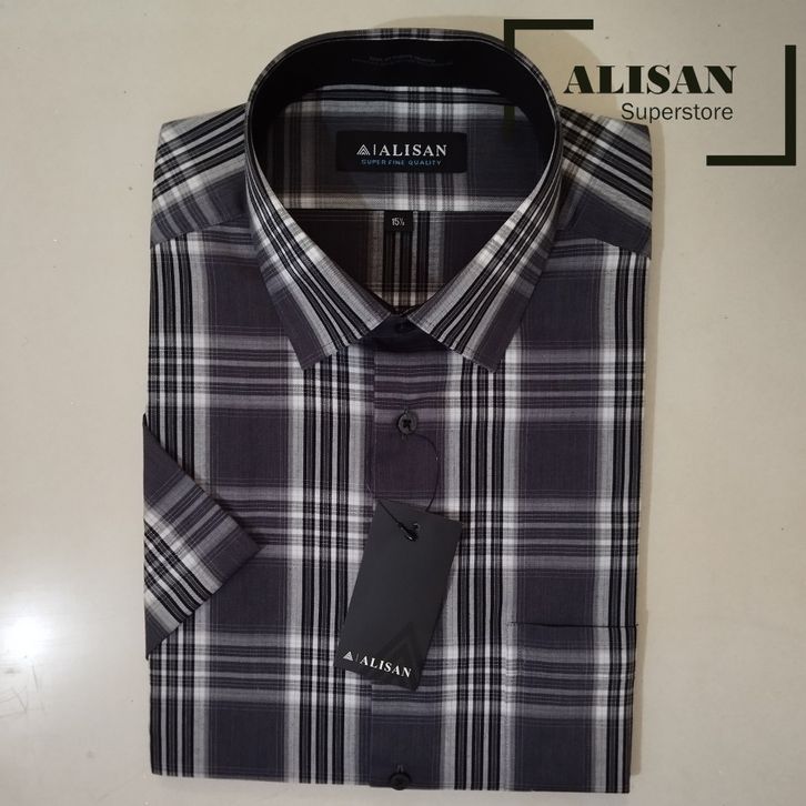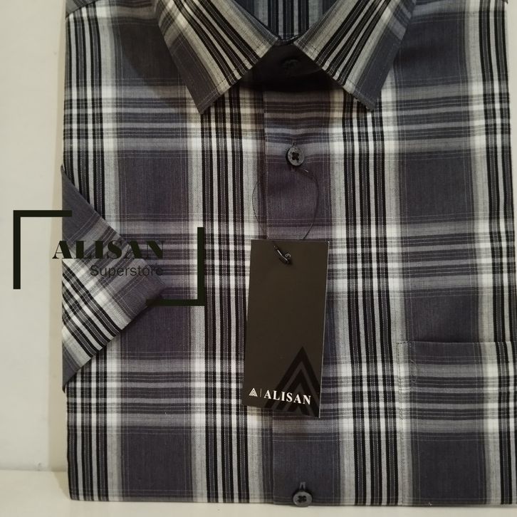 KEMEJA PRIA ALISAN MOTIF KOTAK SALUR COKLAT LENGAN PENDEK REGULER ABU