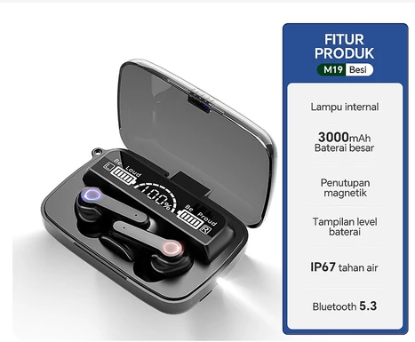 Headset Bluetooth M19 Full Bass Stereo Tws Earphone Powerbank 3500 Mah