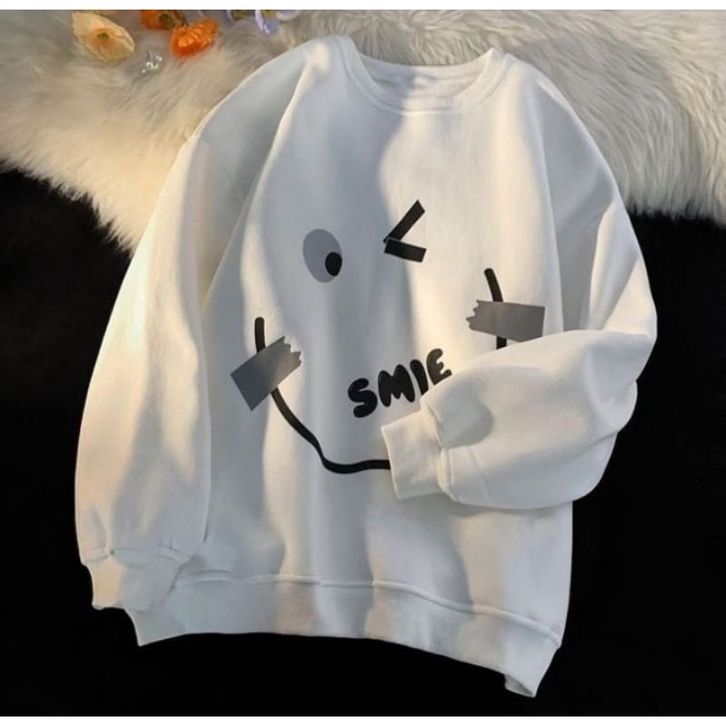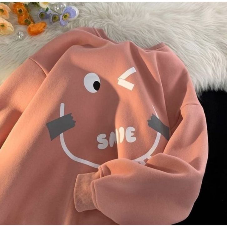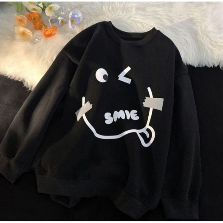 SWEATER OVERSIZE WANITA EMOTE SMILE CREWNECK OVERSIZE WANITA KOREAN STYLE SWITER BASIC BAJU HANGAT OOTD FASHION KEKINIAN