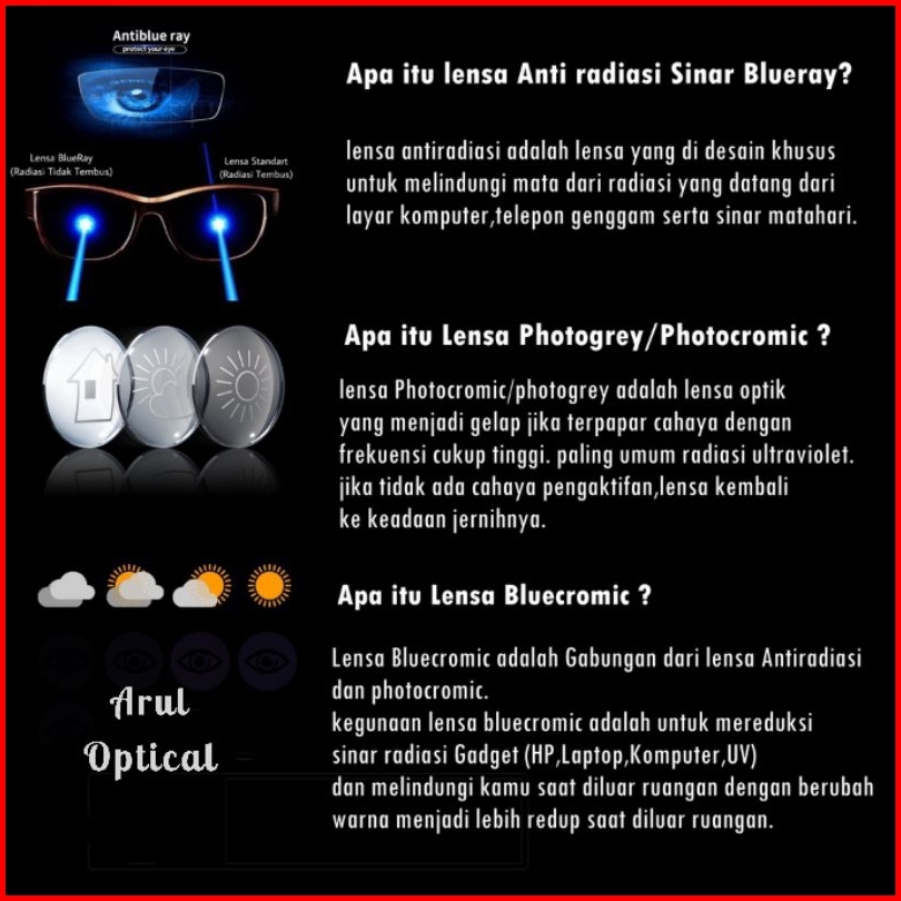 Frame Saja, Frame+Antiradiasi, Frame+Blueray, Frame+Photocromic, Frame+Bluecromic
