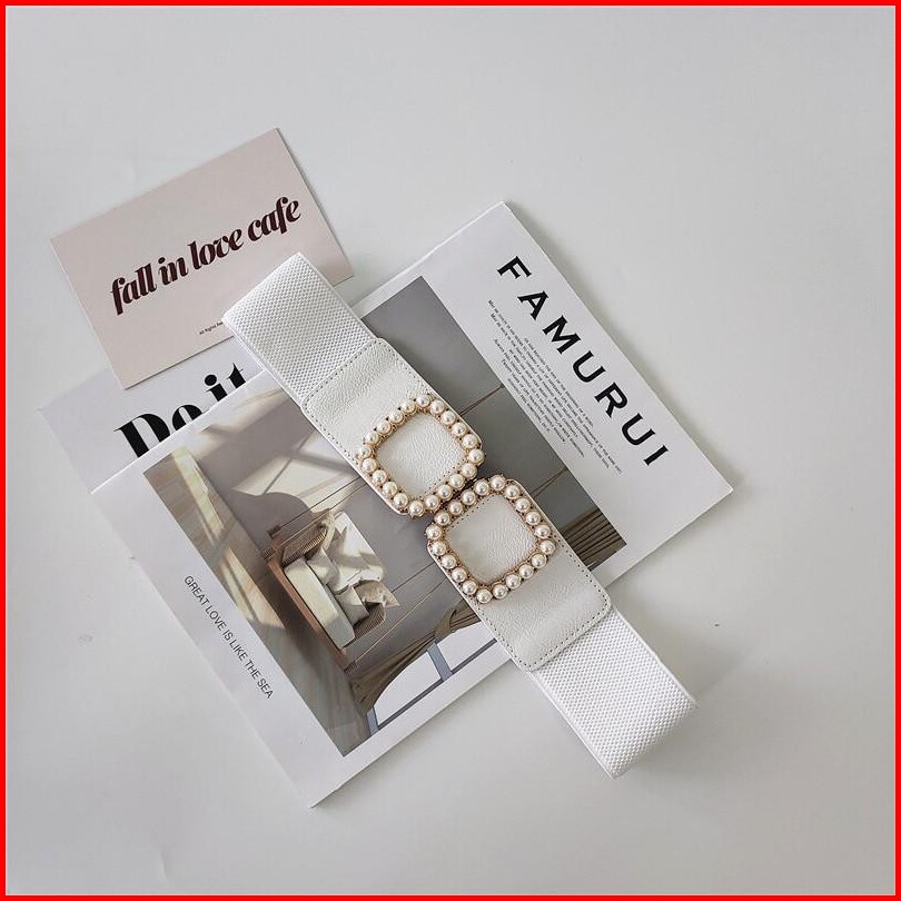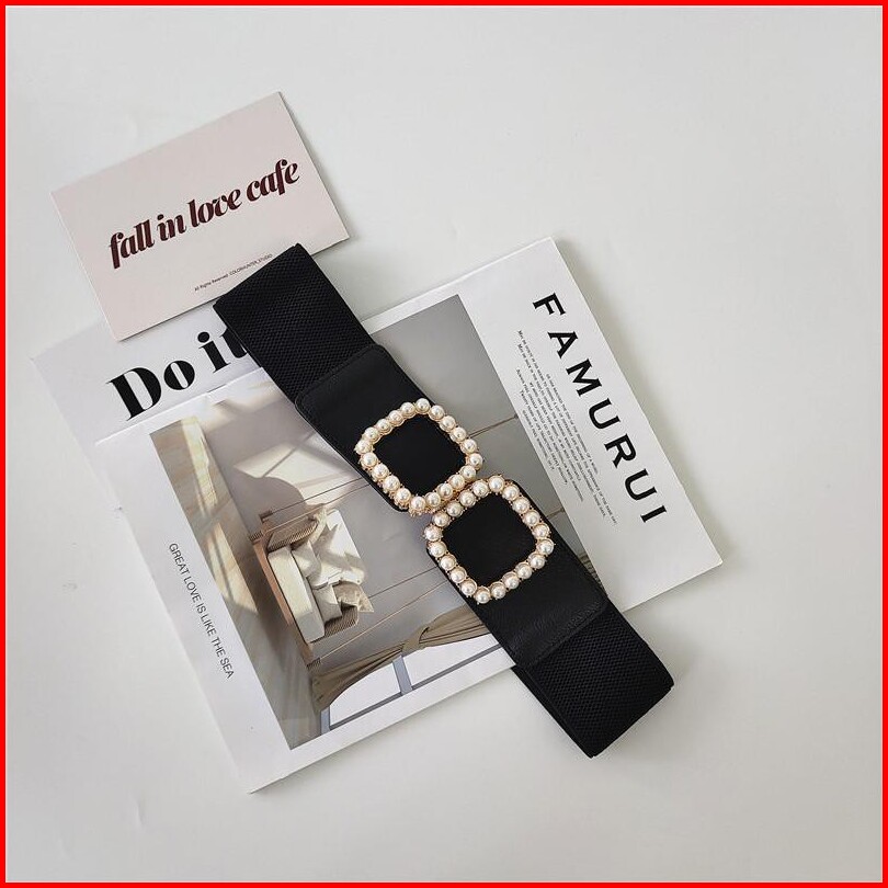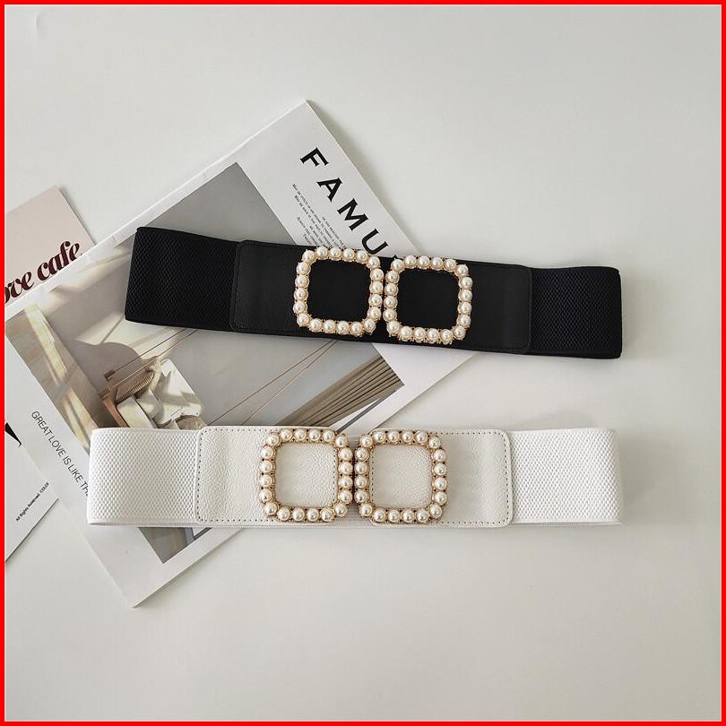 Vendi - Belt Square Pearl Wide Karet Elastis Waistband Ikat Pinggang Retro