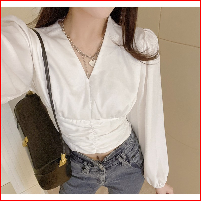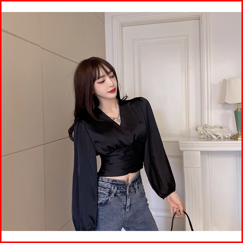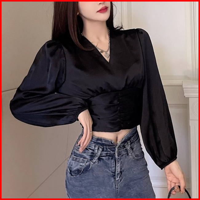 Anya Casual Blouse Satin Long Sleeve Vneck Pakaian Wanita Lengan Panjang