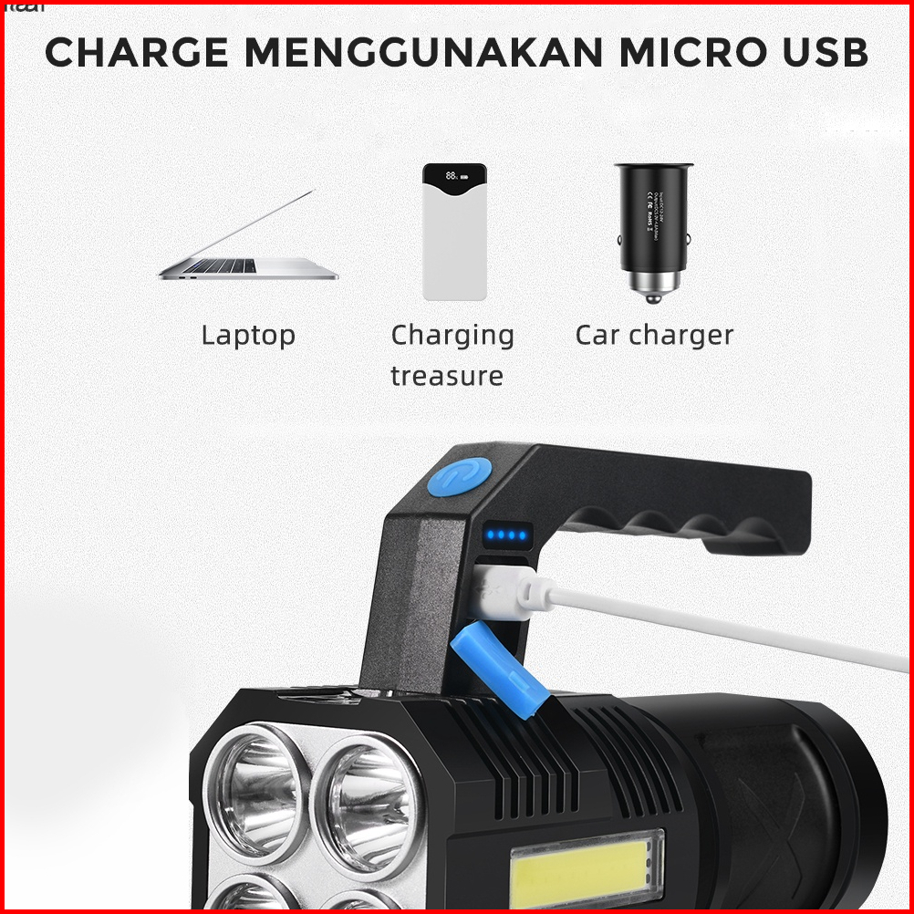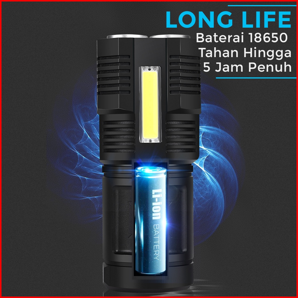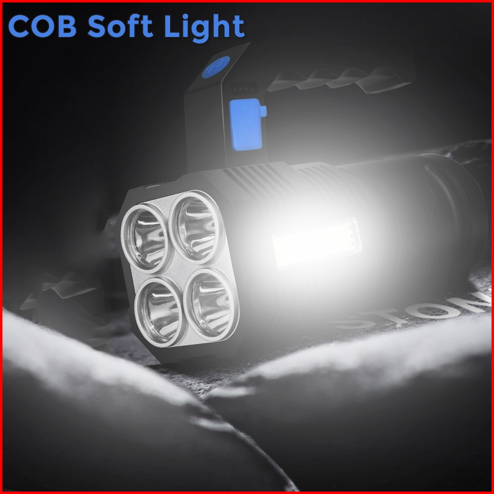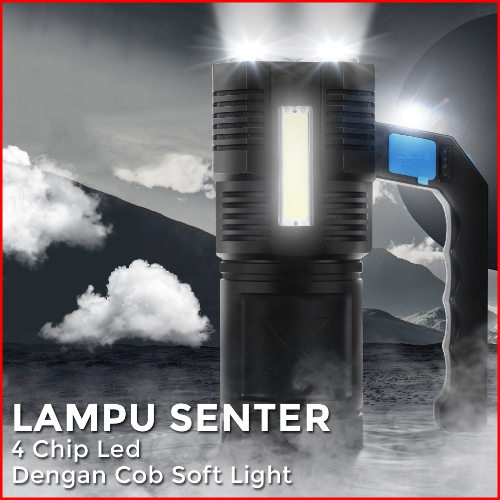 Senter Led Sorot Jarak Jauh 4 Led Dan Cob Light Super Terang Anti Air Waterproof Senter Camping Berburu
