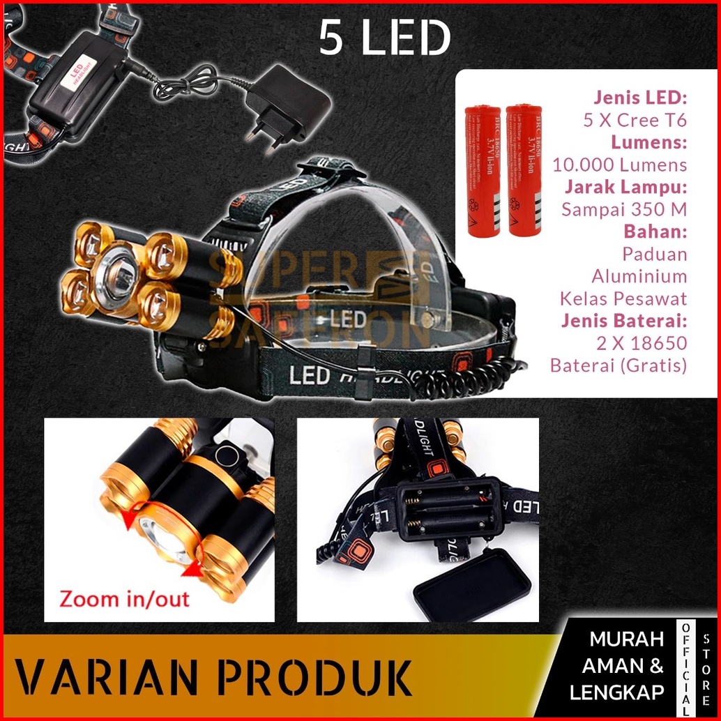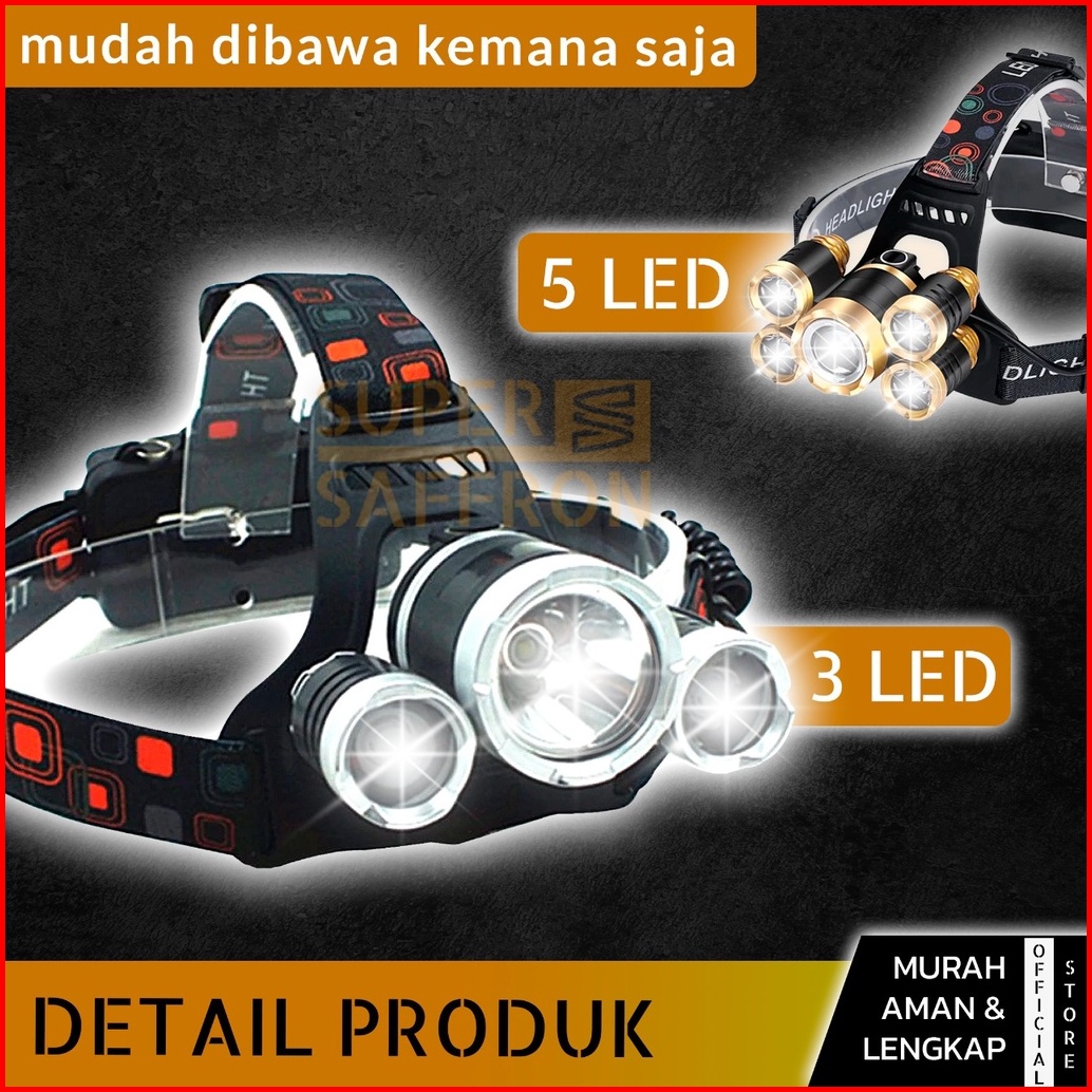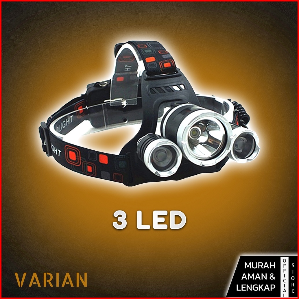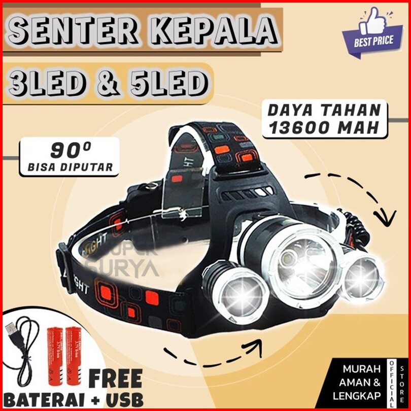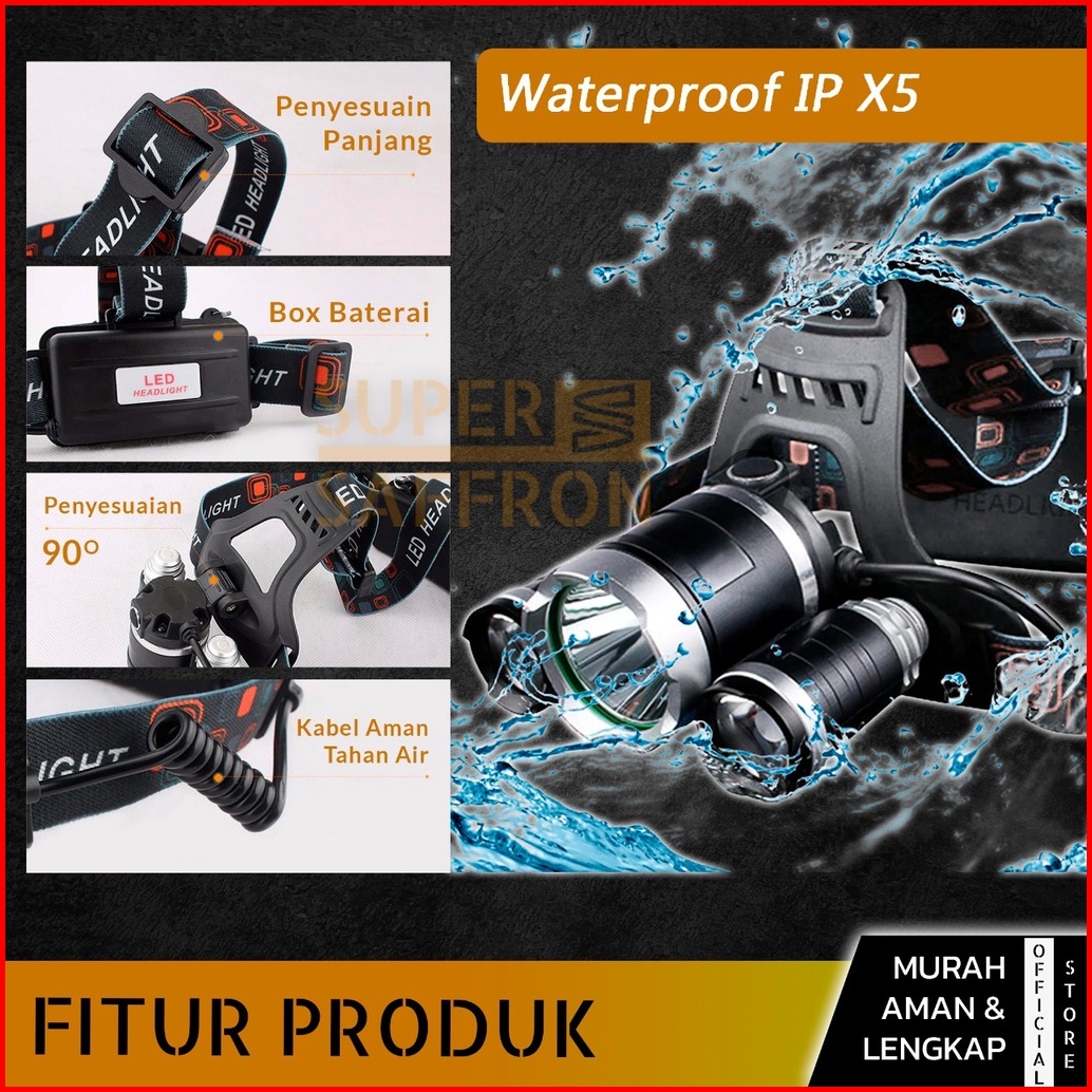 Senter Kepala 3 Mata Led Super Terang Rotasi 90 4500 Mah Xml T6 800 Lumens