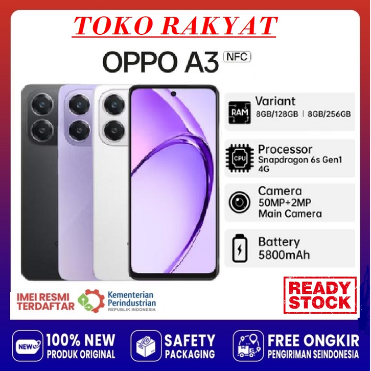 (BEBAS ONGKIR) Hp Oppo A3 Nfc 4G 8+128GB | Snapdragon 6s Gen 1 | Camera 50MP | Batery 5100mAh 45W | Garansi Resmi
